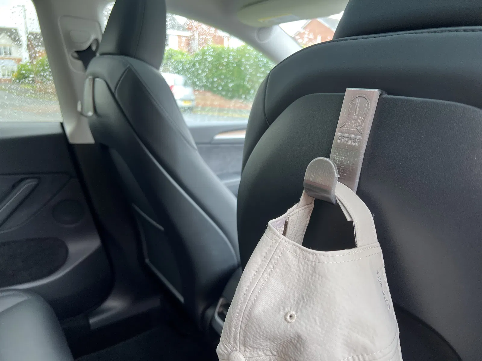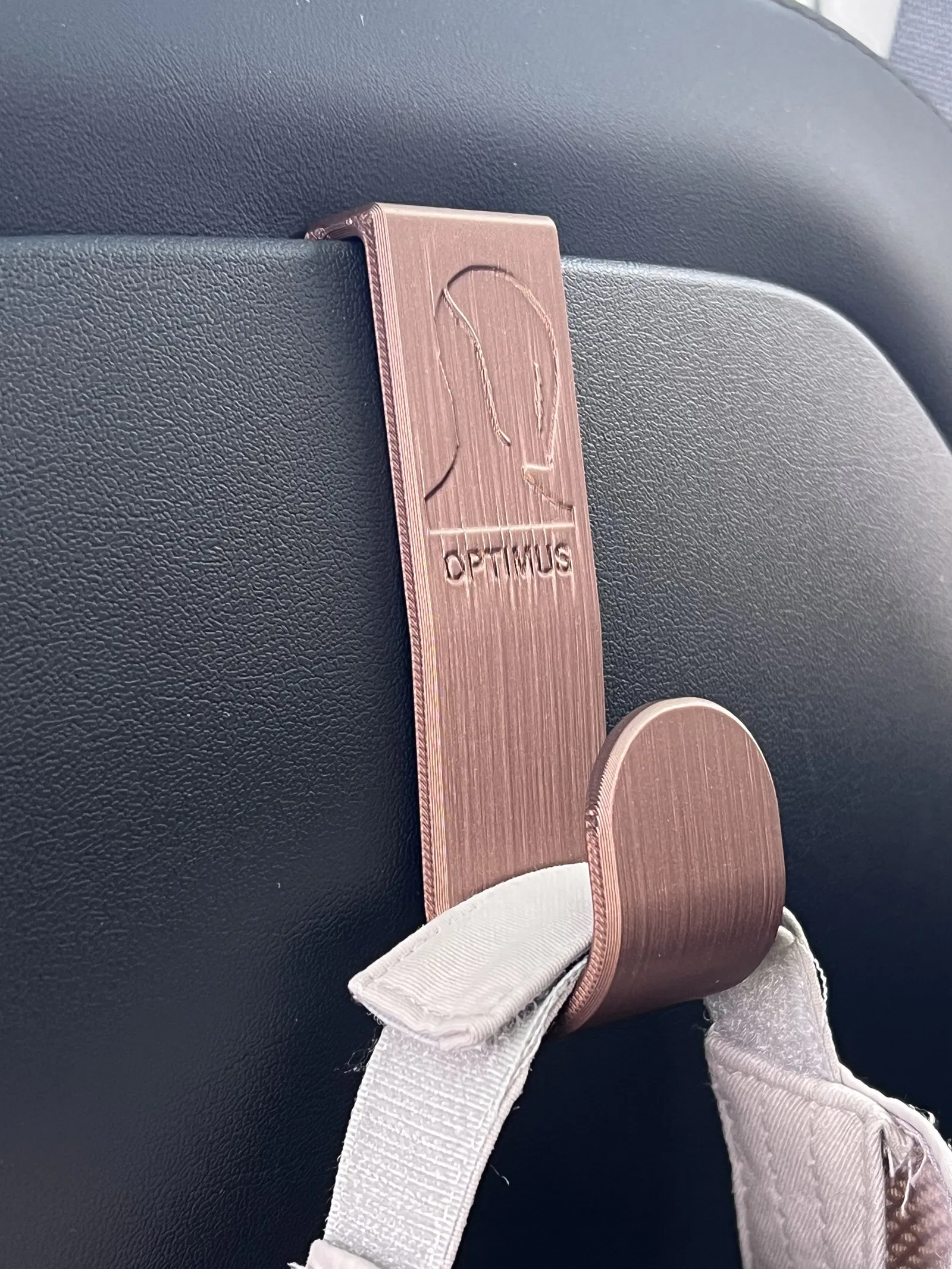 Móc treo ghế sau cho TESLA Model Y, có hai tùy chọn logo: Optimus hoặc Tesla. Thích hợp để treo mũ, túi rác nhỏ. Khuyến cáo in bằng PETG, in nghiêng, 25% infill. Không cần supports.