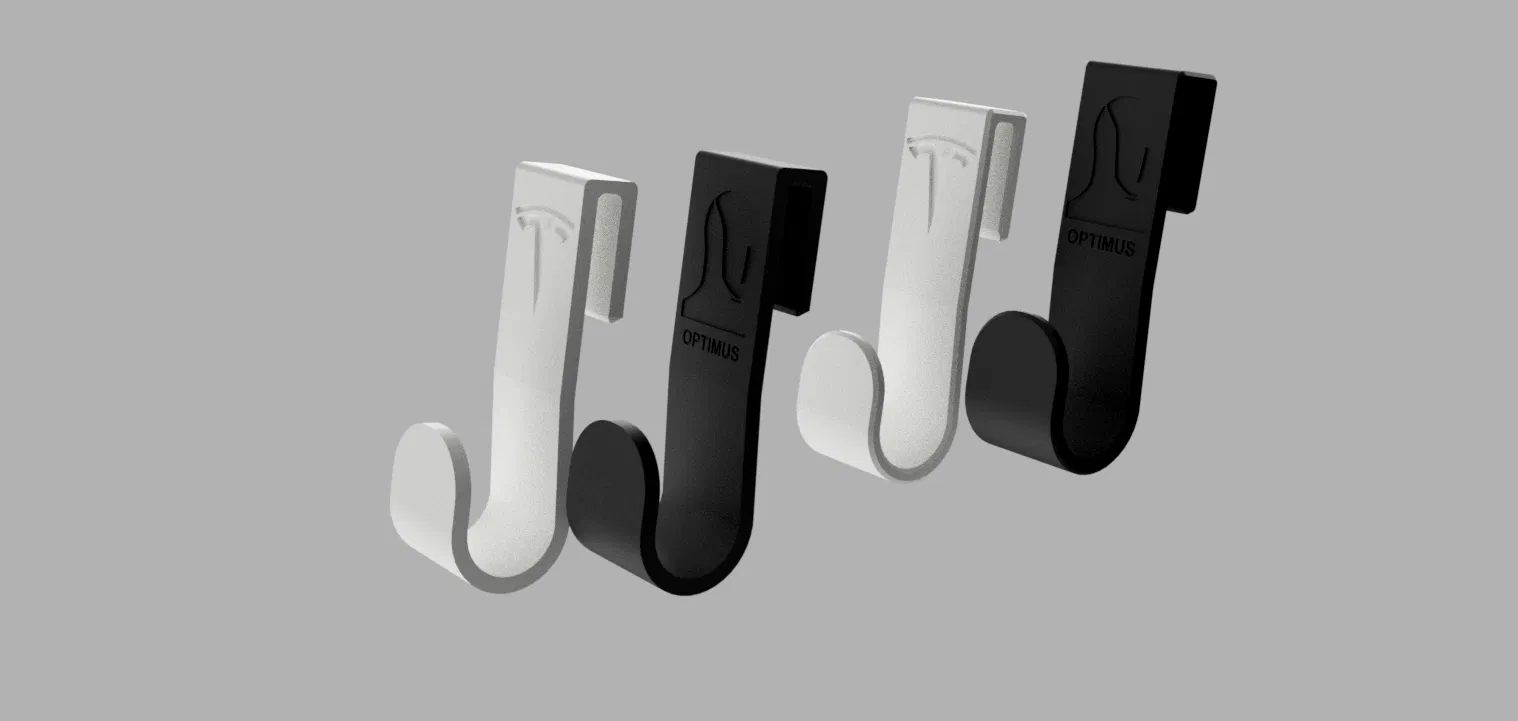 Một cặp móc treo ghế sau dành cho TESLA Model Y. Một mẫu có khắc logo Optimus và một mẫu có khắc logo Tesla.