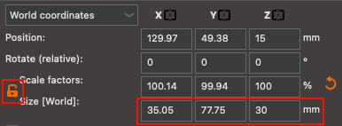 Chọn bộ phận chèn, đảm bảo "tỷ lệ khóa" đã được tắt và điều chỉnh nhẹ kích thước X và/hoặc Y khi cần thiết (ở đây tôi đã thay đổi X và Y 0,05 mm để chúng trượt vào dễ dàng):