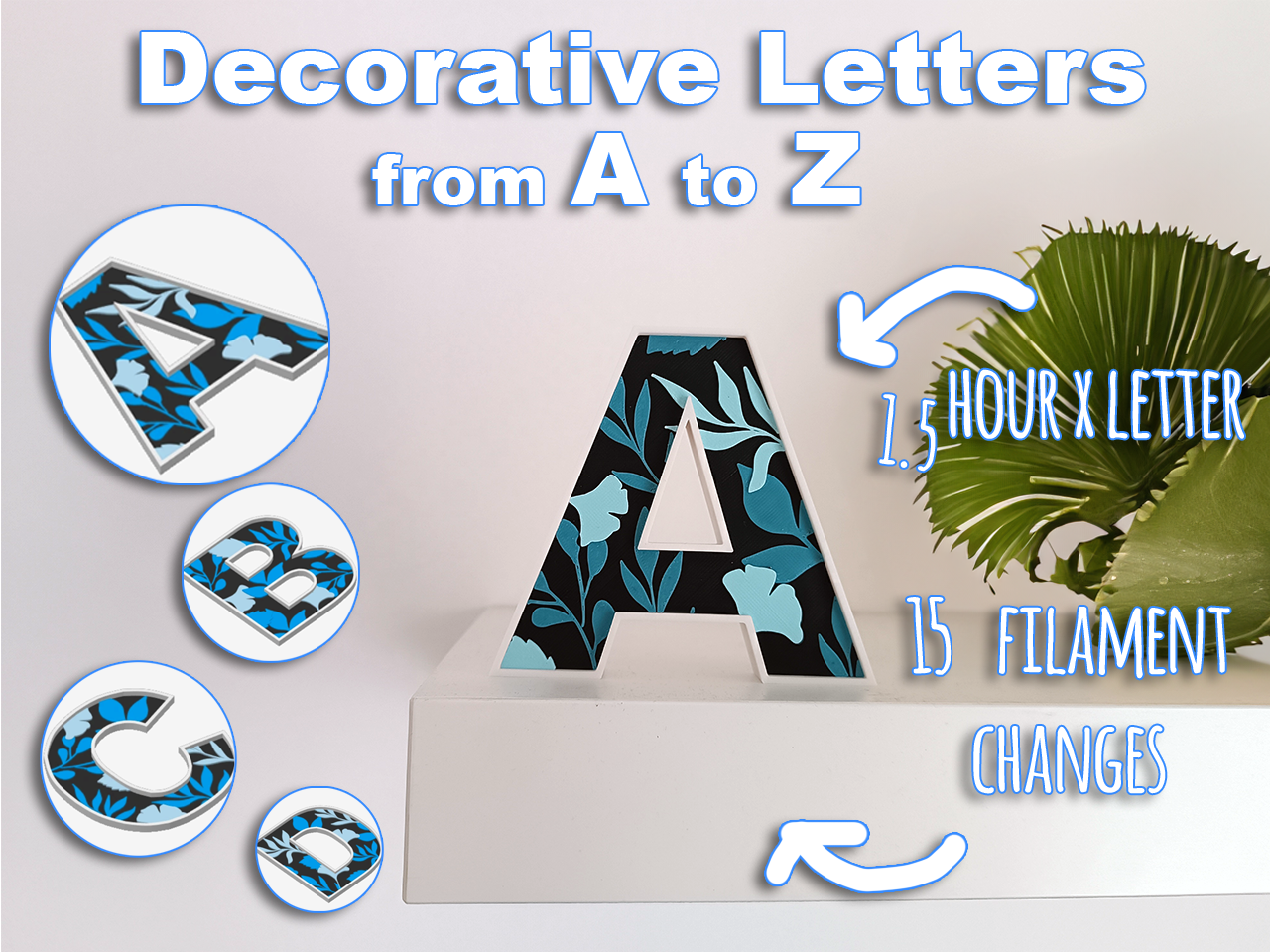 Bộ sưu tập đầy đủ các Chữ Cái Trang Trí Đứng Tự Do (A-Z), kèm theo ký hiệu '&' và '♥' để bạn có thể ghép các dòng chữ phức tạp. In ấn dễ dàng, chỉ với 15 lần đổi màu cho mỗi chữ. Thích hợp để trang trí bàn làm việc hoặc kệ sách.
