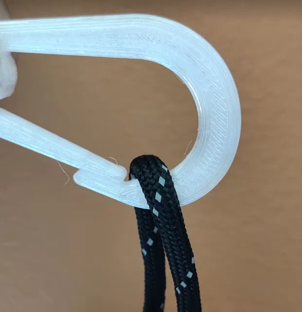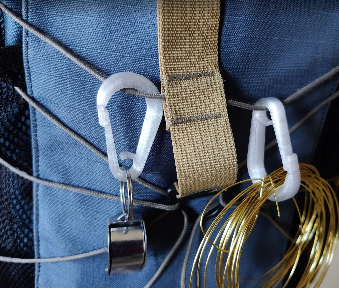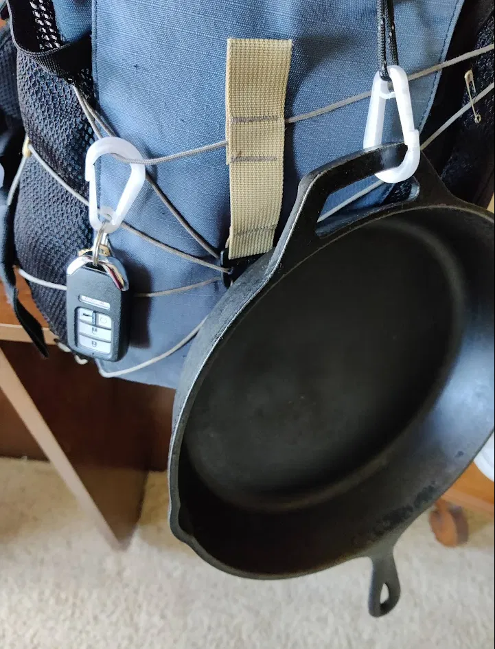 Cái móc này có thêm một cái núm nhỏ ở cạnh trong phía trên, để giảm khả năng nó bị tuột ra ngoài ý muốn. Nhìn nó hao hao giống cái đầu con thiên nga. Nó đã được thiết kế lại cho chắc chắn hơn. Sẽ hơi kỳ cục nếu móc cái chảo rán nặng 2.5 kg lên ba lô của bạn (2.5 kg = 5.5 lb), nhưng mà bạn có thể làm được đó!