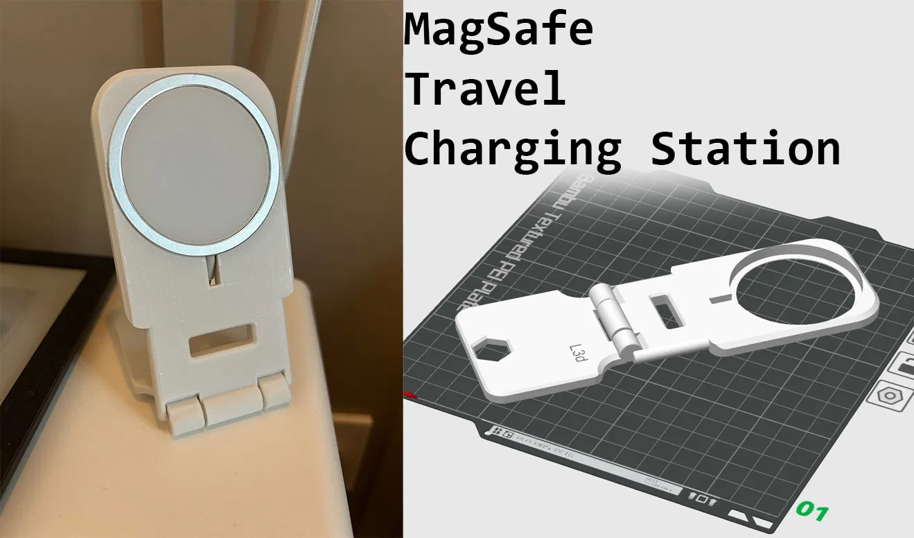 Trạm Sạc MagSafe Du Lịch: Một thiết kế đế sạc MagSafe in một mảnh, tối ưu không gian ba lô, dễ quấn cáp. Thích hợp cho du lịch, in bằng PLA hoặc PETG trên máy Bambu Lab.