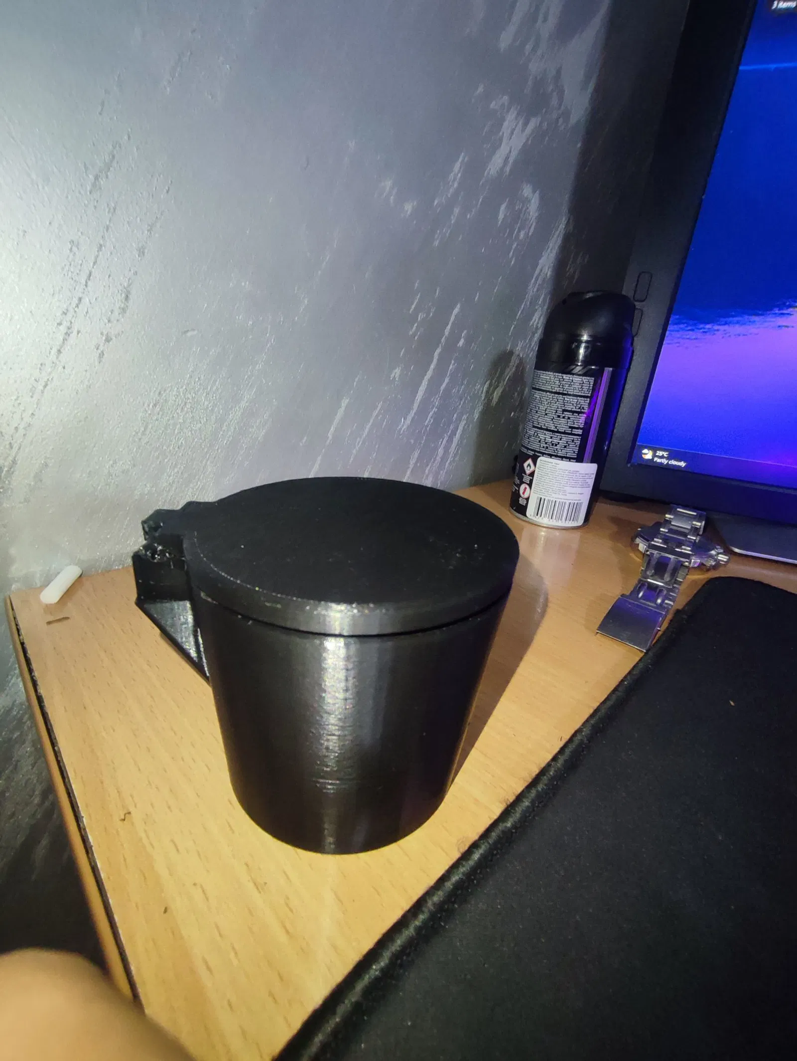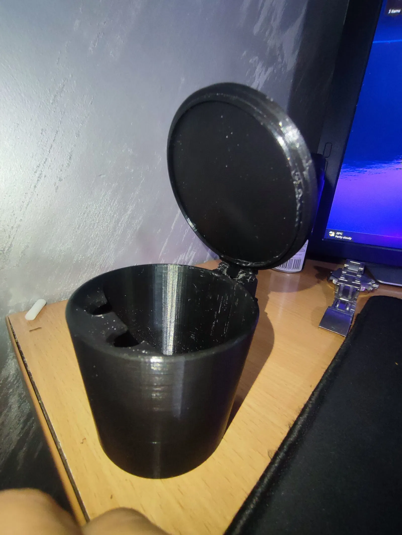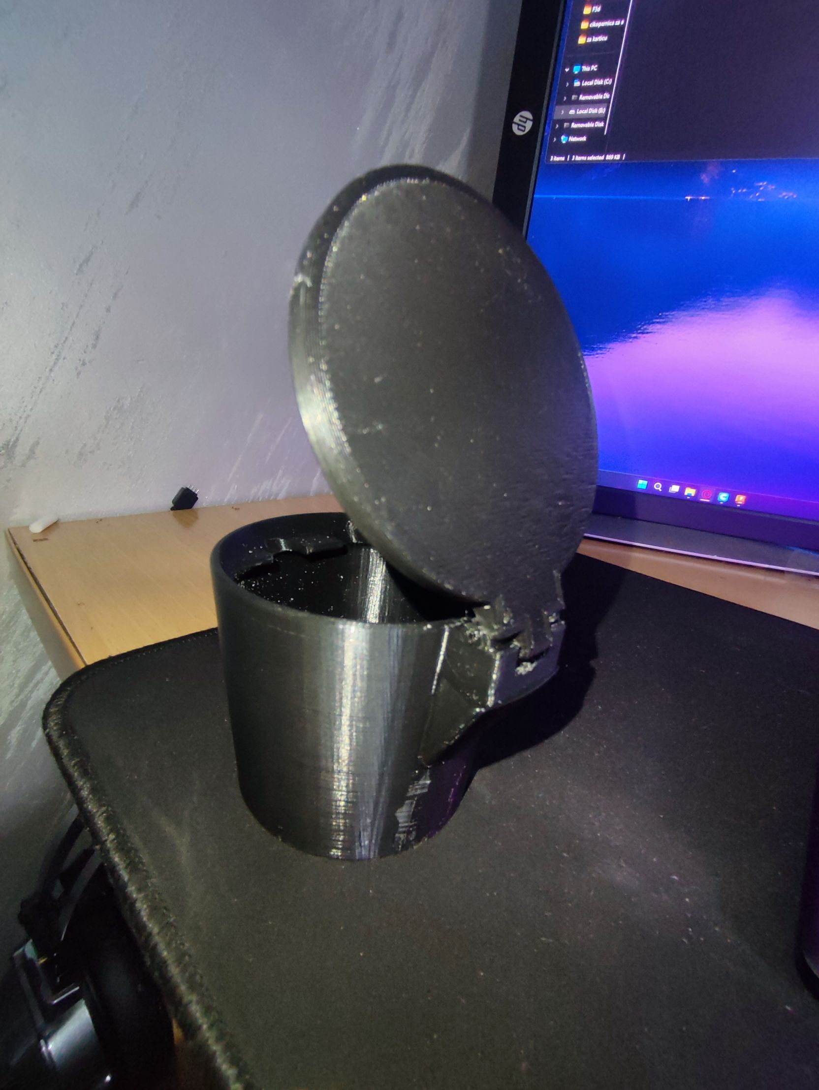 Mô hình gạt tàn kiêm chỗ để ly nước có nắp, được thiết kế để đặt vừa vặn vào hộc đựng ly trên xe hơi. Phiên bản này có thêm nắp đậy với bản lề, giúp giữ mùi và bụi bẩn bên trong hiệu quả hơn.