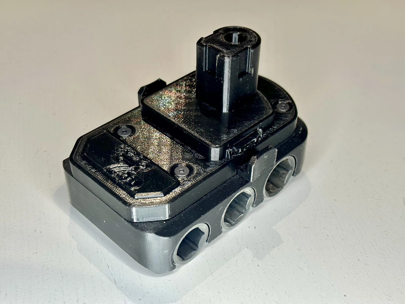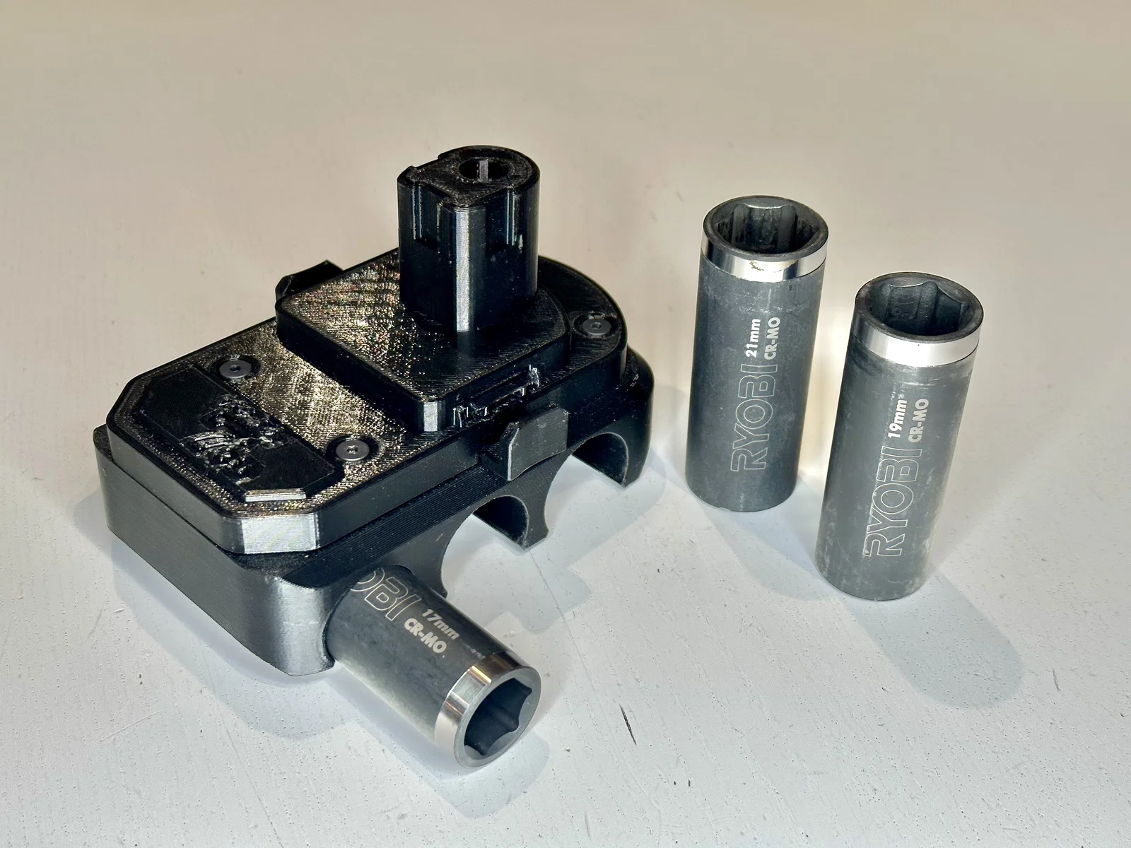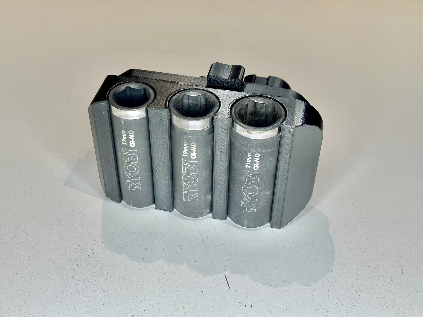 Vì tôi chắc chắn sẽ mất những ổ cắm này khoảng 12-15 phút sau khi mua, tôi cần một nơi nào đó để lưu trữ chúng, và nơi nào tốt hơn bên dưới công cụ sử dụng chúng. Vì vậy, tác phẩm này phù hợp với công cụ Ryobi 18V vĩ đại của Super7 và clip trên trình điều khiển tác động của tôi. Tôi sử dụng các chèn ren từ CNC Kitchen và lỗ có kích thước tương ứng. Nếu chúng bắt đầu làm sạch nhựa, tôi có thể thêm nhiều nam châm.