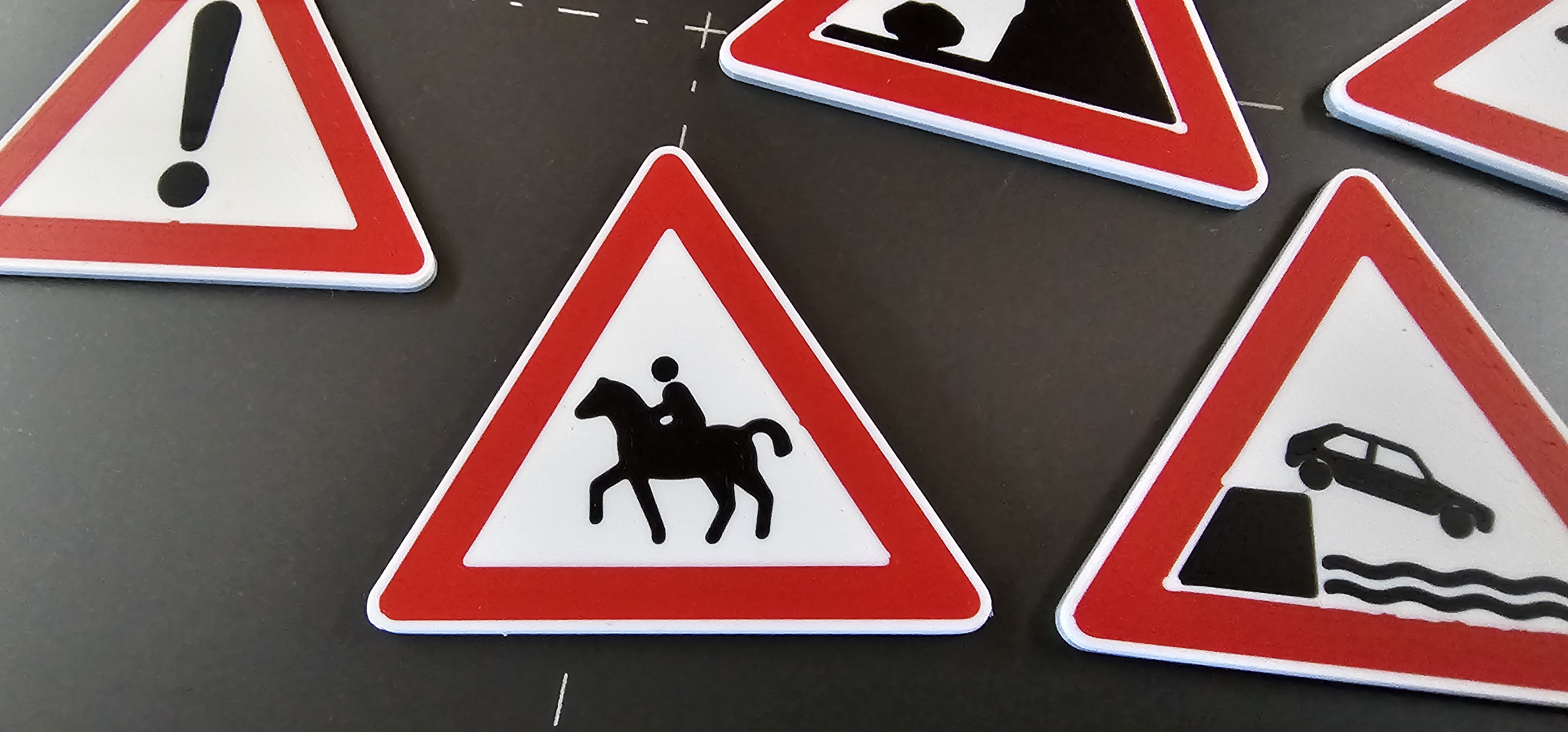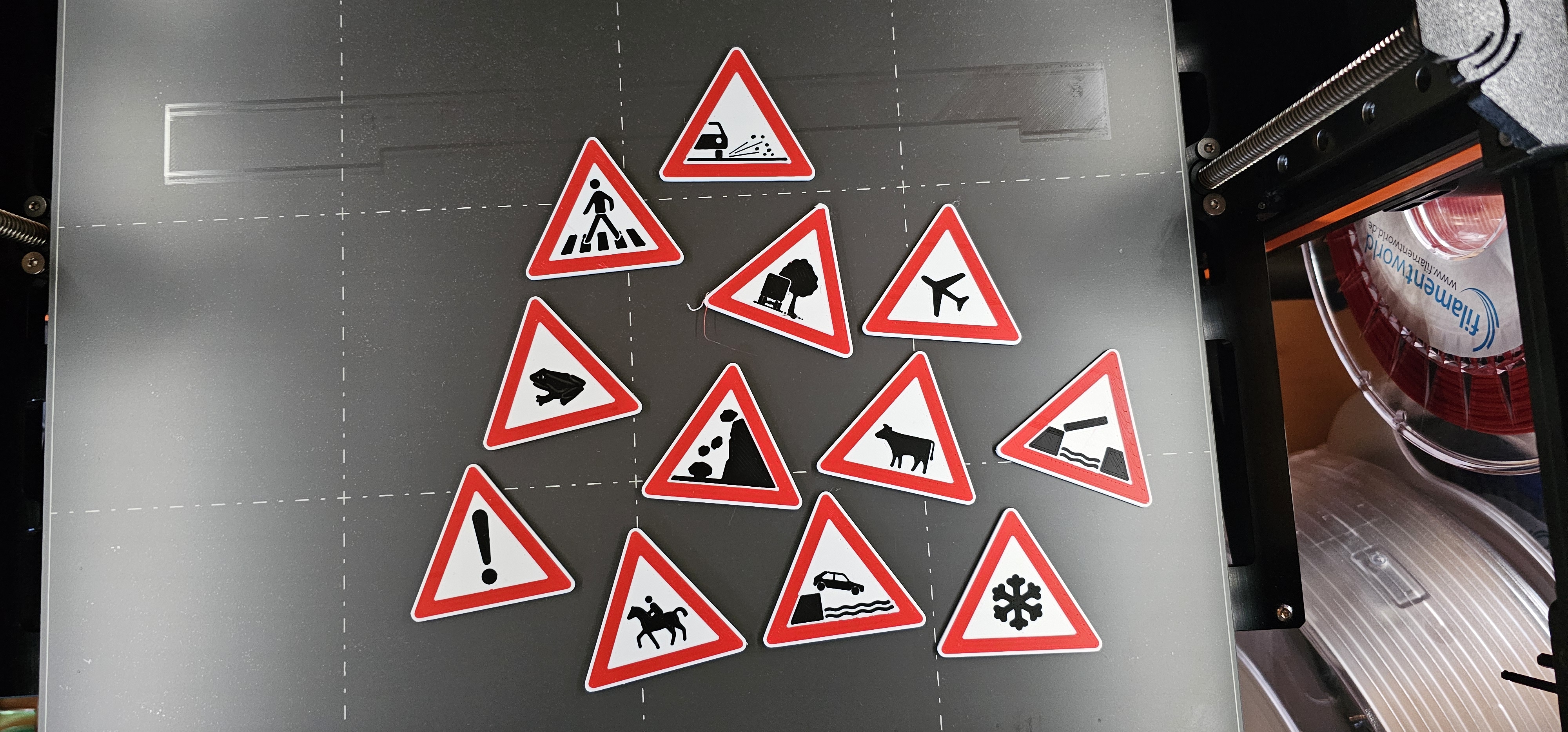 Biển báo Giao thông Đức 101-xx "Cảnh báo". Có thể in đa màu hoặc thay đổi filament. Bao gồm các tệp mf3 để tùy chỉnh màu sắc trong slicer. Có thể điều chỉnh kích thước và thêm lỗ khoan. Hướng dẫn cách lấy biển báo cho hai bên đường bằng cách phản chiếu.