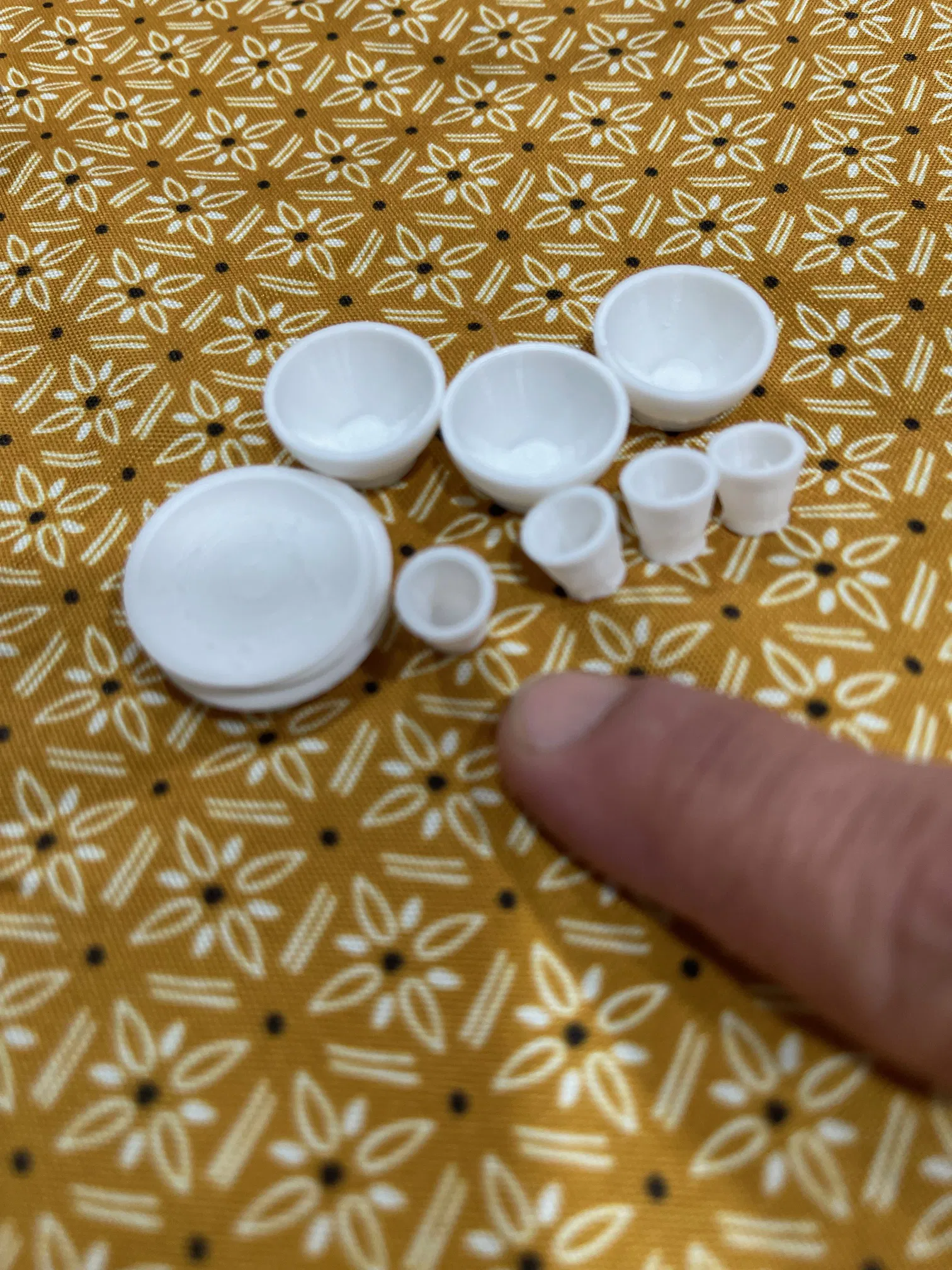 Bộ chén đĩa mini nhà búp bê với tỷ lệ 1:12. Sản phẩm được in màu trắng và phủ UV Coat để tạo hiệu ứng bóng bẩy, lấp lánh như thật. Thích hợp cho các mô hình nhà búp bê và đồ chơi thu nhỏ.