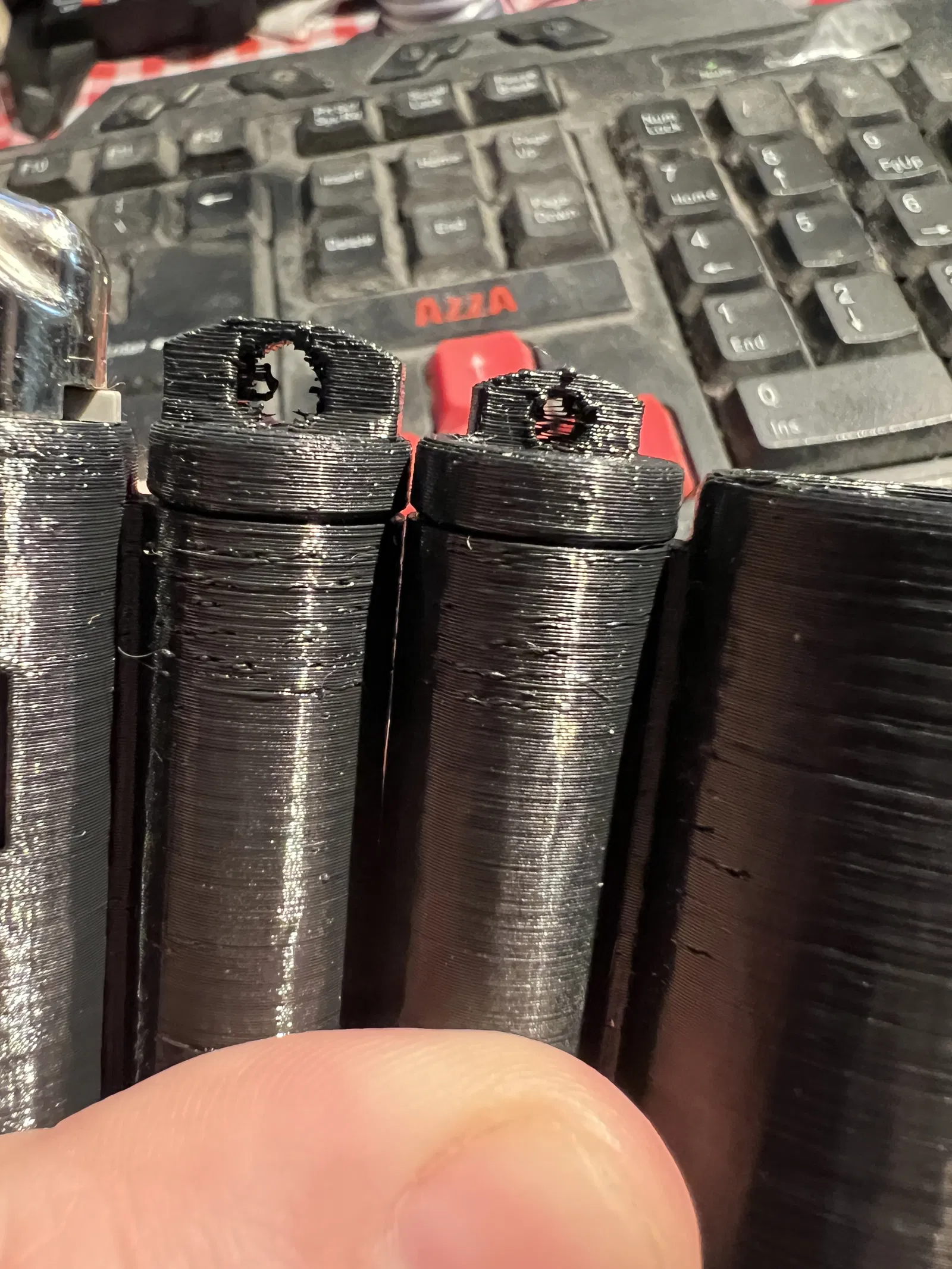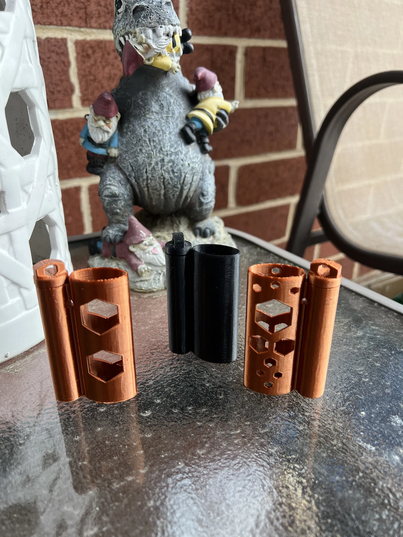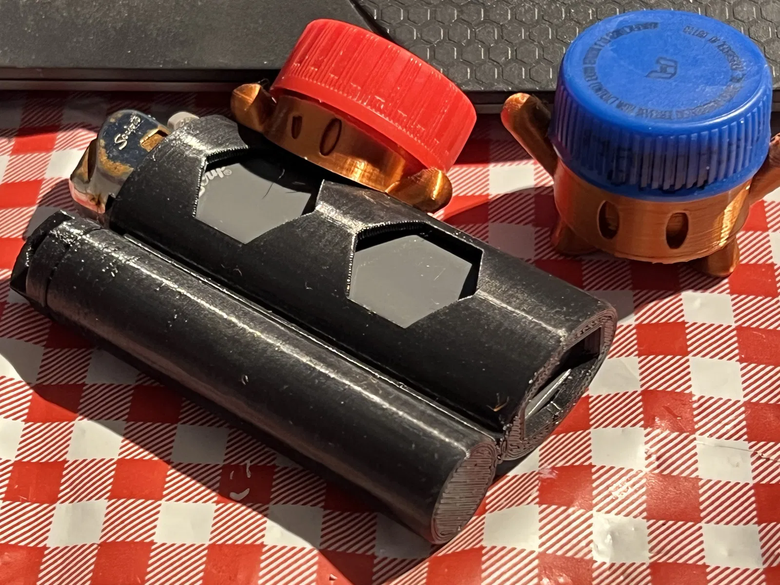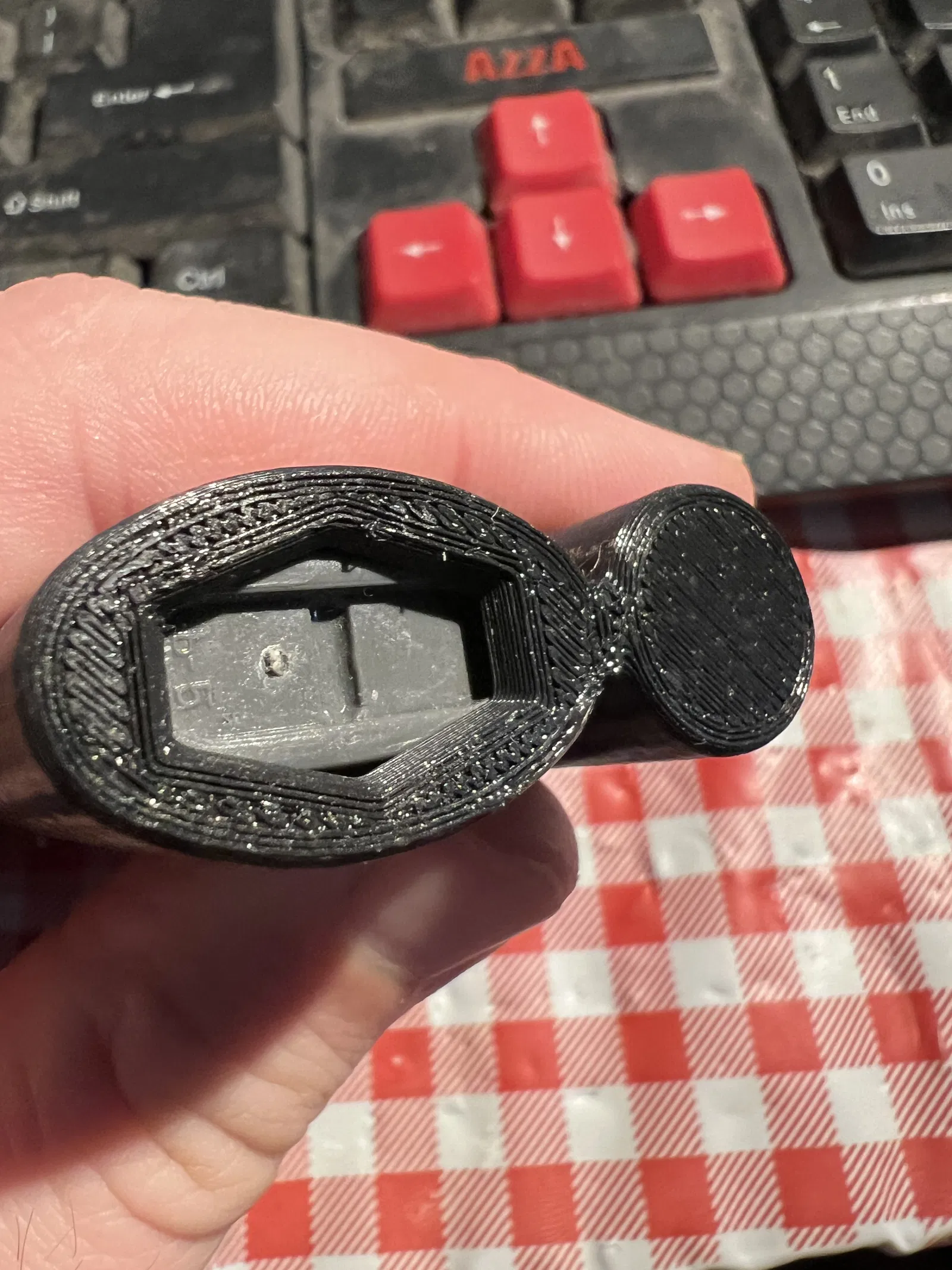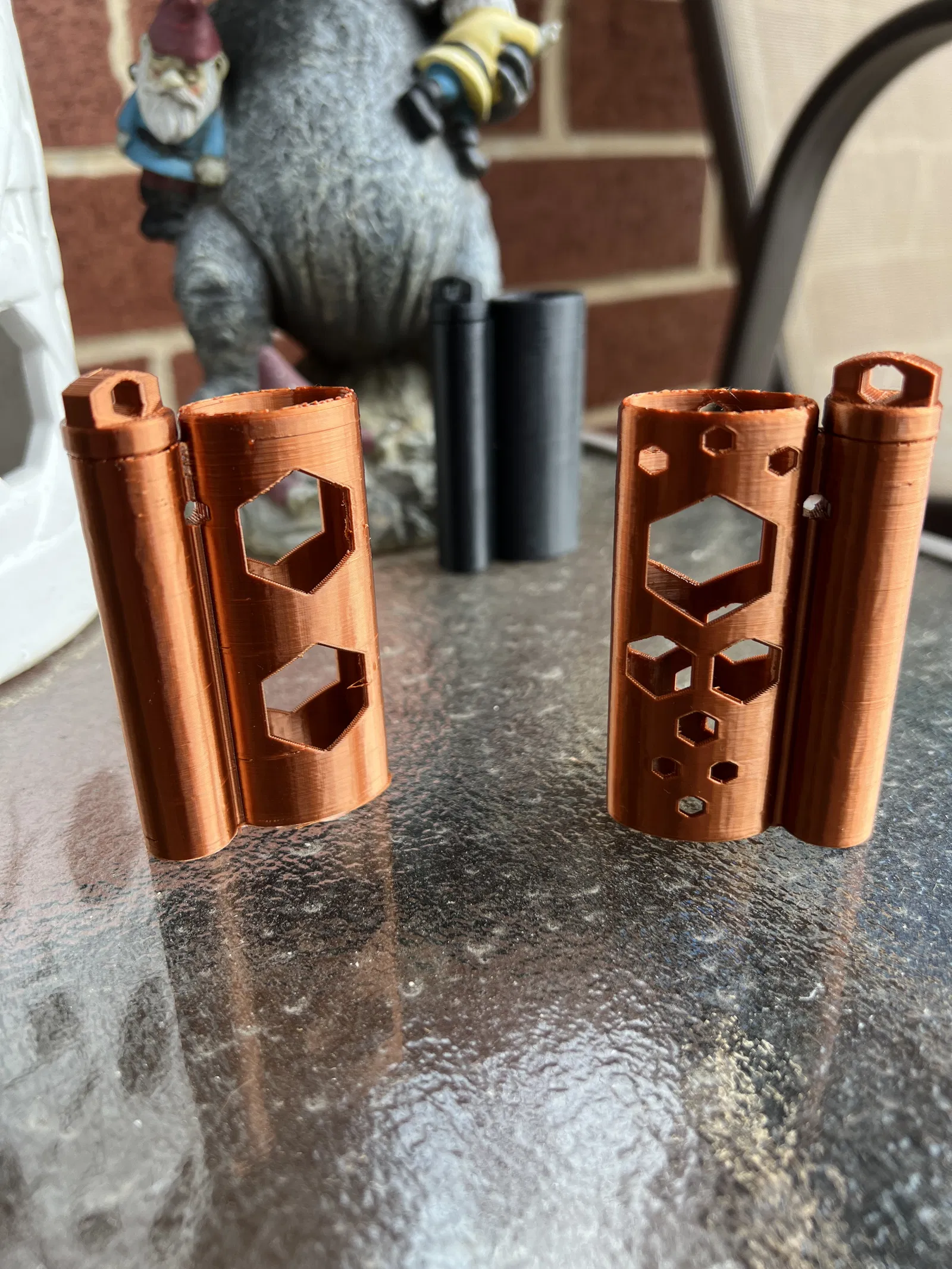 Phần lưỡi gà trên nắp đã được làm to và loe ra để tăng độ bám dính giữa các lớp in. Lỗ cũng đã được làm lớn hơn để vừa với dây paracord hoặc vòng chìa khóa lớn hơn. Các lỗ có hình lục giác để tăng khả năng in.