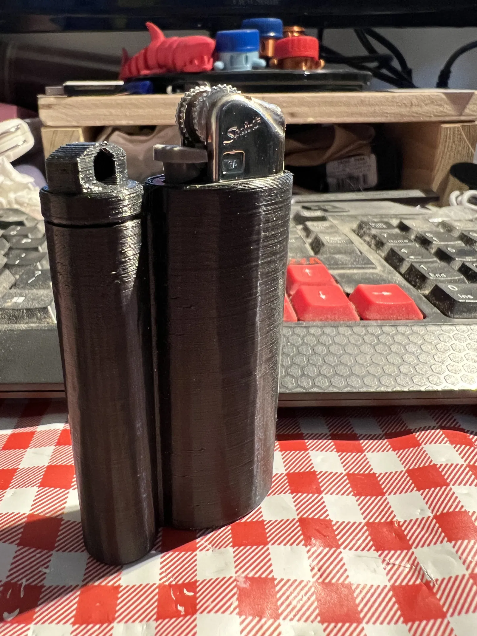 Đây là bản chỉnh sửa của hộp đựng bật lửa Bic có tích hợp chỗ để đồ. Chỗ để đồ có đường kính bên trong khoảng 12 mm và sâu 65 mm. Nắp hộp rỗng để tăng thêm không gian. Bạn có thể để kim chỉ may vá, dụng cụ mồi lửa, tiền, bật lửa khẩn cấp, điếu thuốc, dao nhỏ, bút chì nhỏ, TBD, bỏ món đồ vui nhộn vào đây, trò đùa này đã hơi cũ rồi, v.v. vào hộp!
