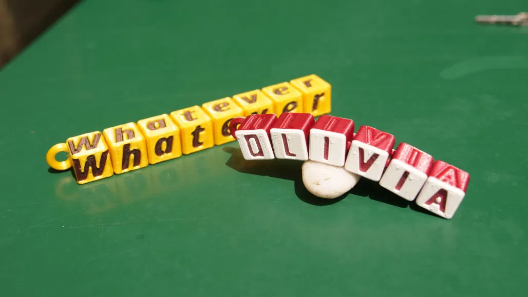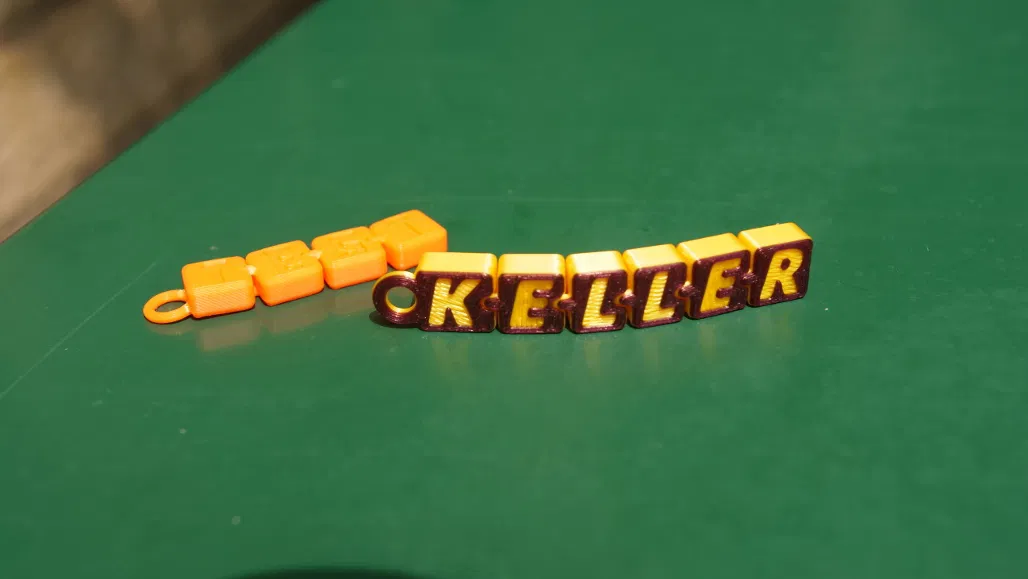 Tạo móc khóa theo ý muốn với tên của bạn hoặc người thân. Các hạt chữ cái được nối với nhau linh hoạt, có thể dùng để nghịch ngợm. Mô hình này in luôn, không cần hỗ trợ. Tùy chỉnh dễ dàng bằng OpenSCAD hoặc công cụ trực tuyến.