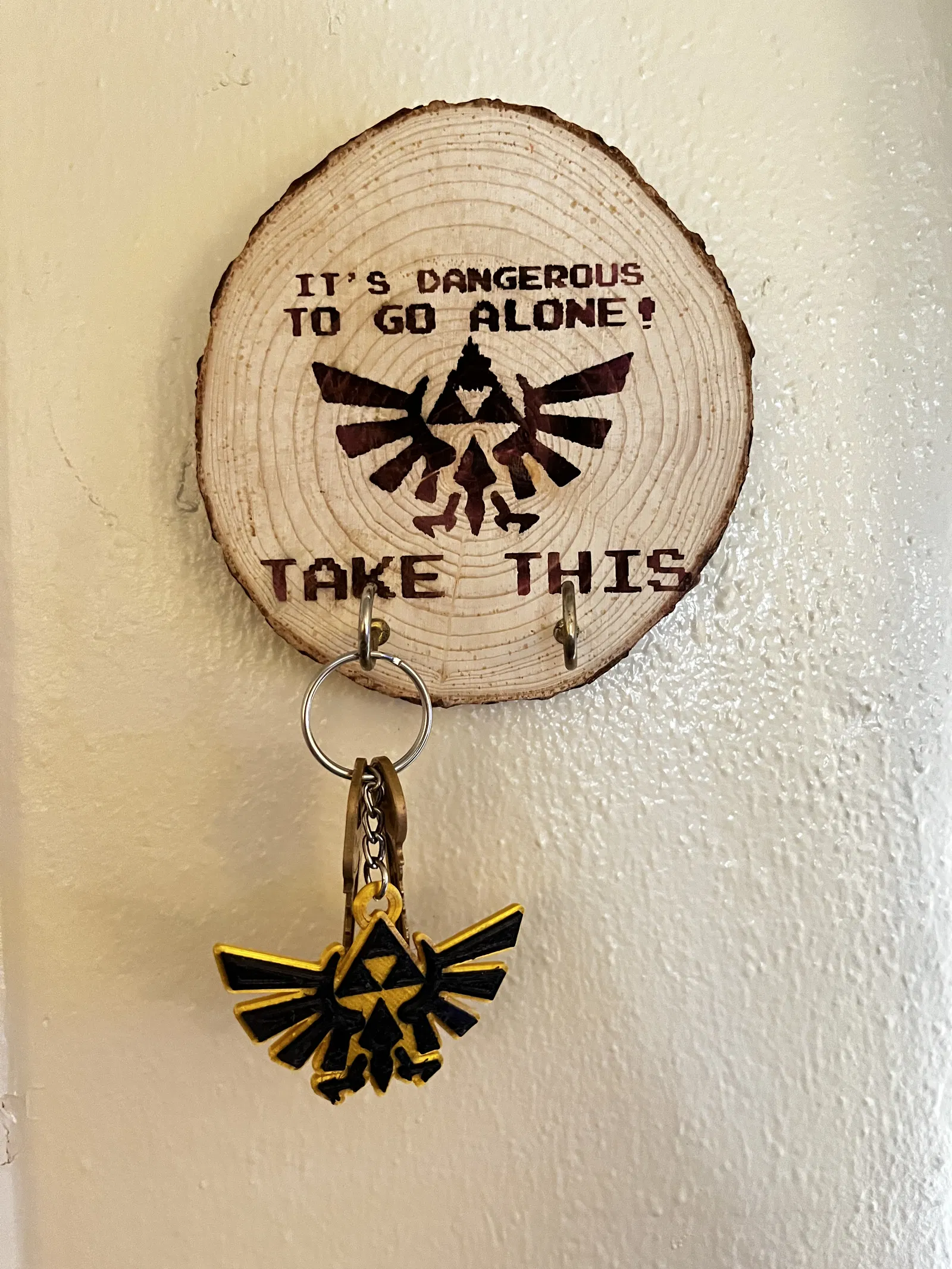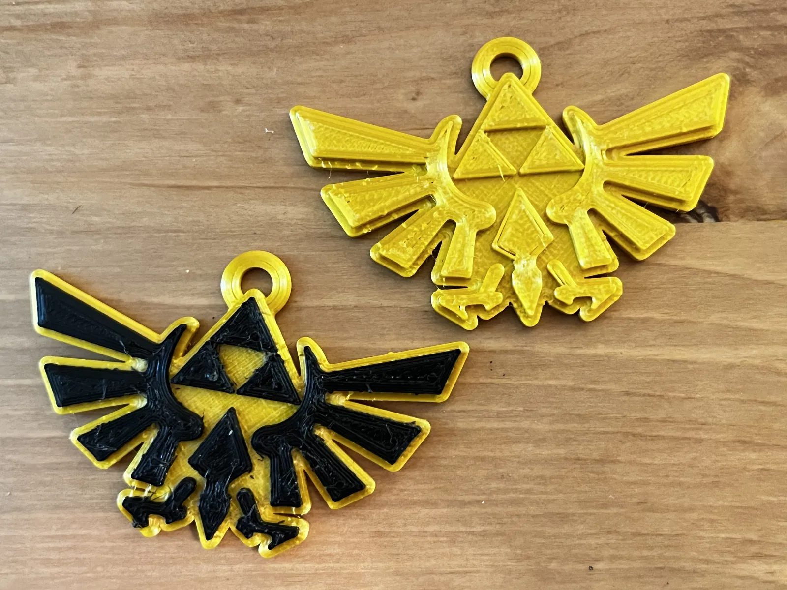 Móc khóa hình Triforce từ game Legend of Zelda. Bạn có thể in một màu hoặc đổi màu ở giữa bản in, đều có thể làm bằng máy in một đầu phun.