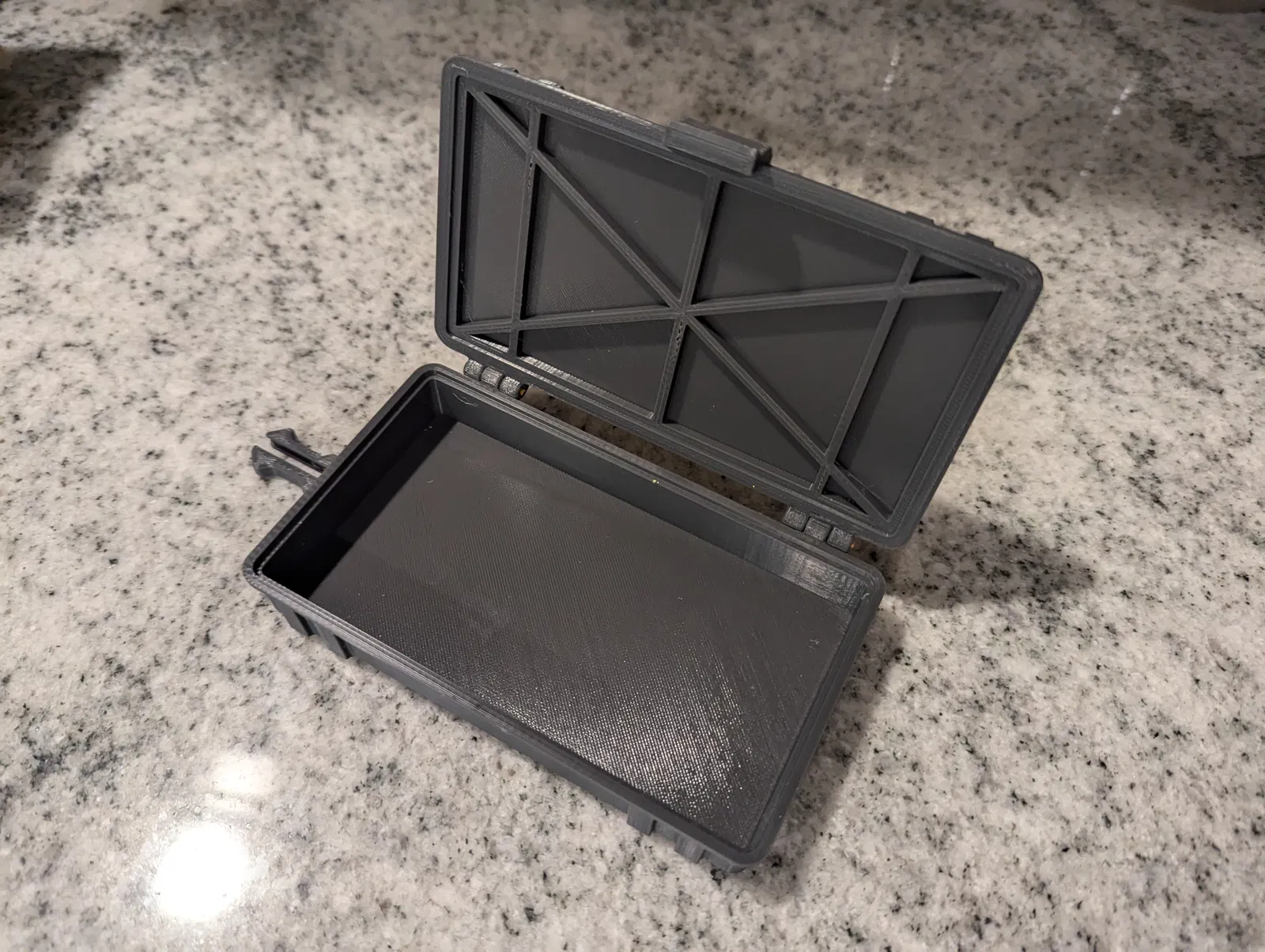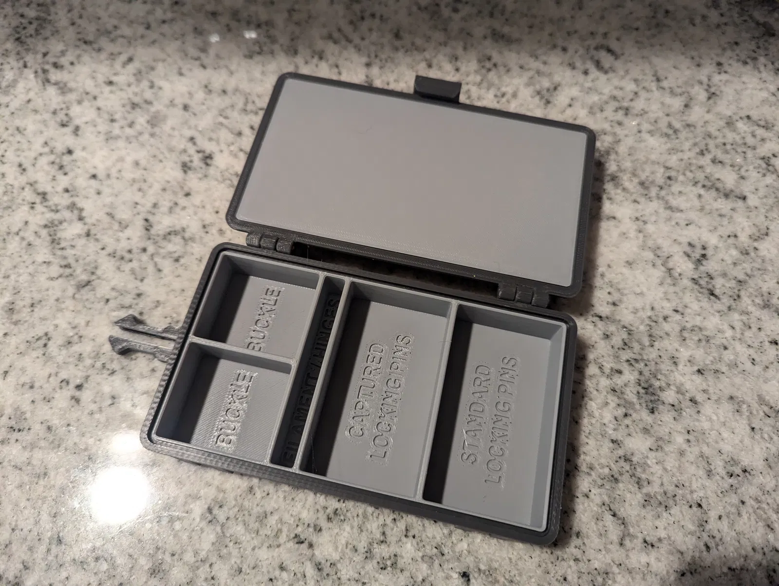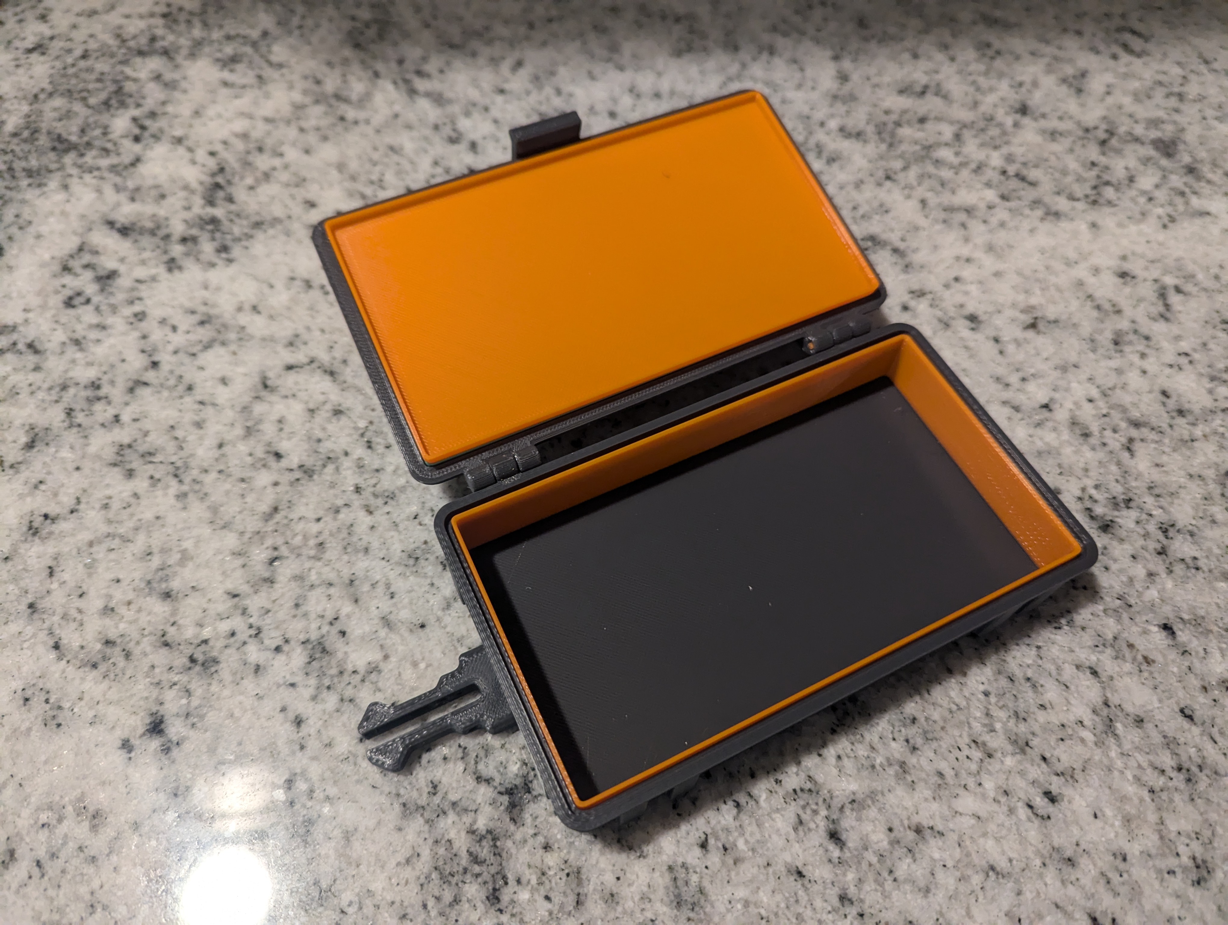 Để đóng hộp đã lắp ráp, chỉ cần ấn hai vỏ lại với nhau, cho đến khi nó đóng lại kêu tách. Để mở, kéo nhẹ vào lẫy giữ ở phía đối diện với bản lề trong khi kéo lên. Lẫy được thiết kế để vừa khít, đảm bảo đồ đạc của bạn không bị rơi ra ngoài ý muốn. Nếu bạn muốn lỏng hơn, bạn có thể chà nhám hoặc giũa điểm bên trong của lẫy, nơi nó tiếp xúc với vỏ đế.