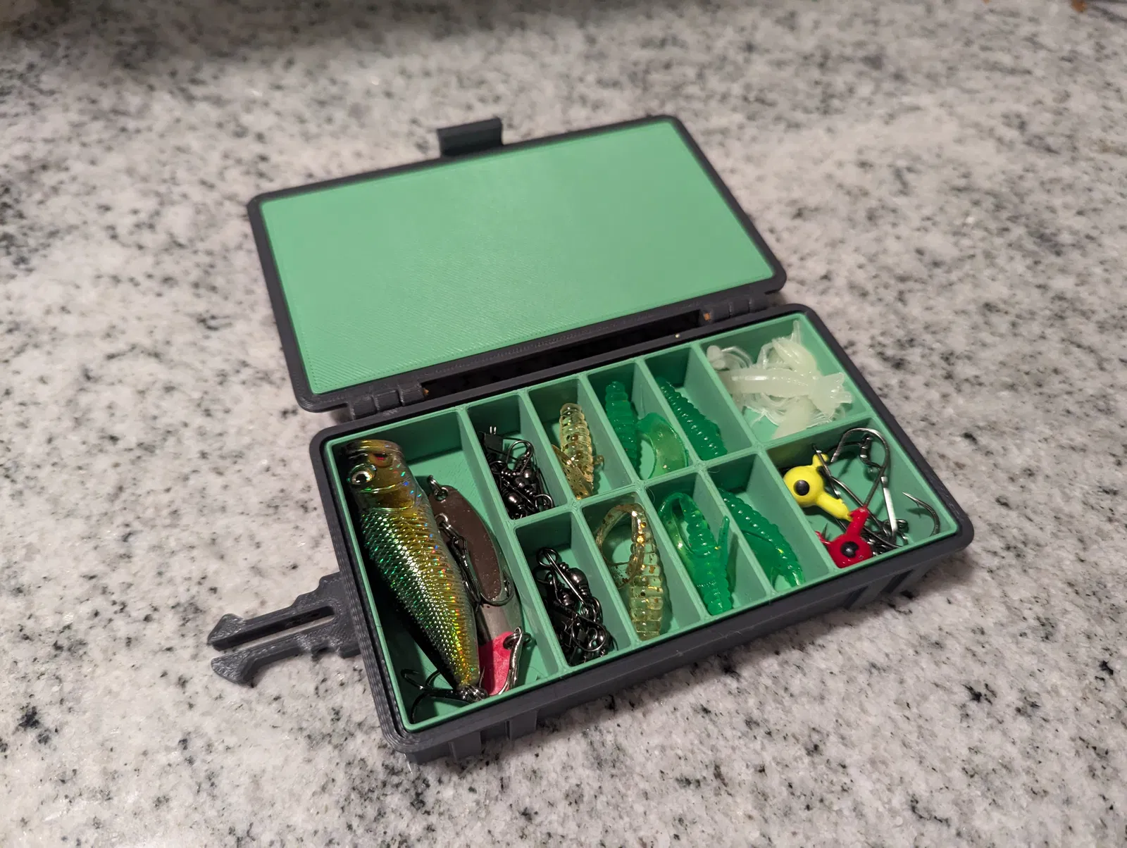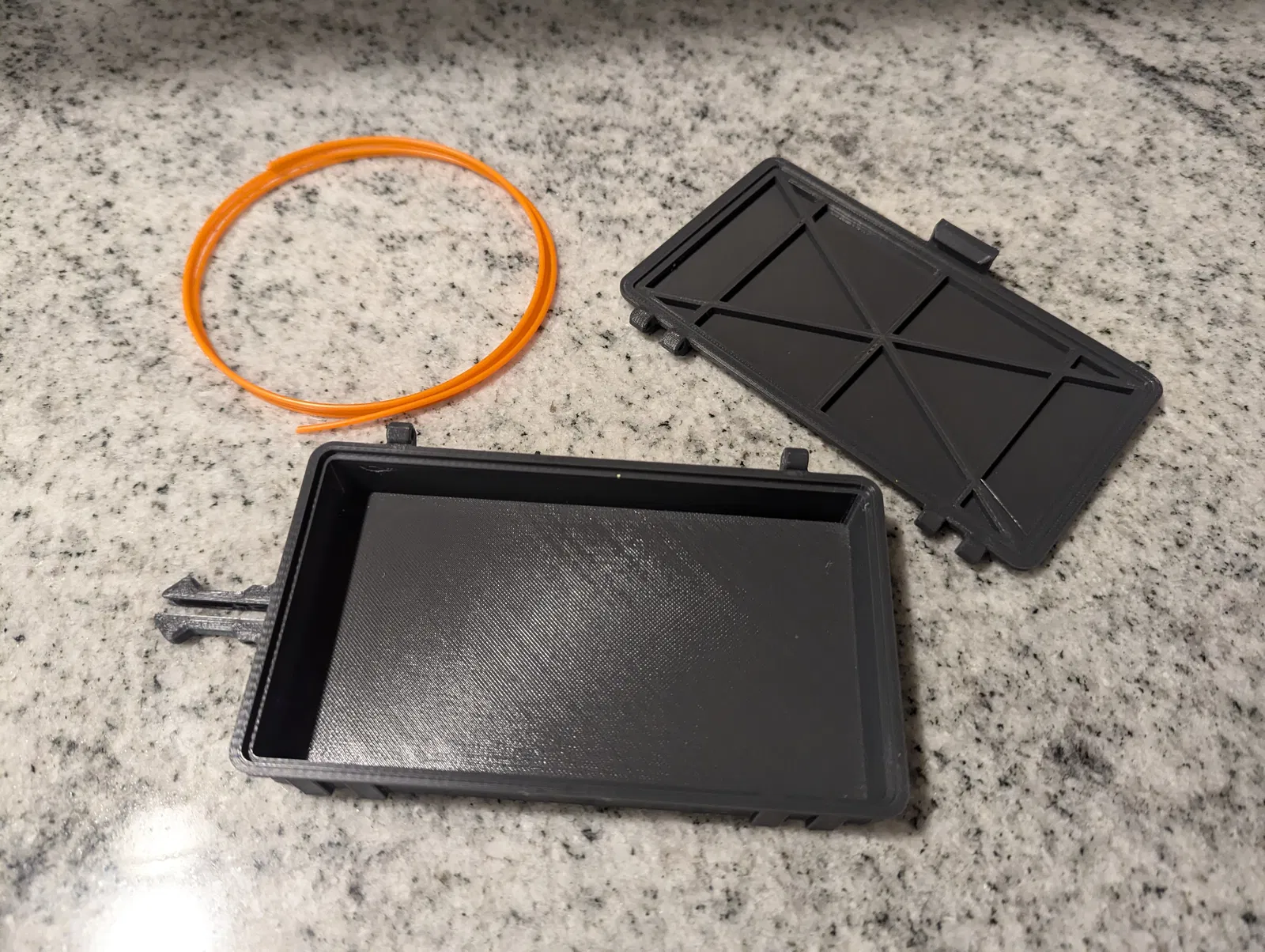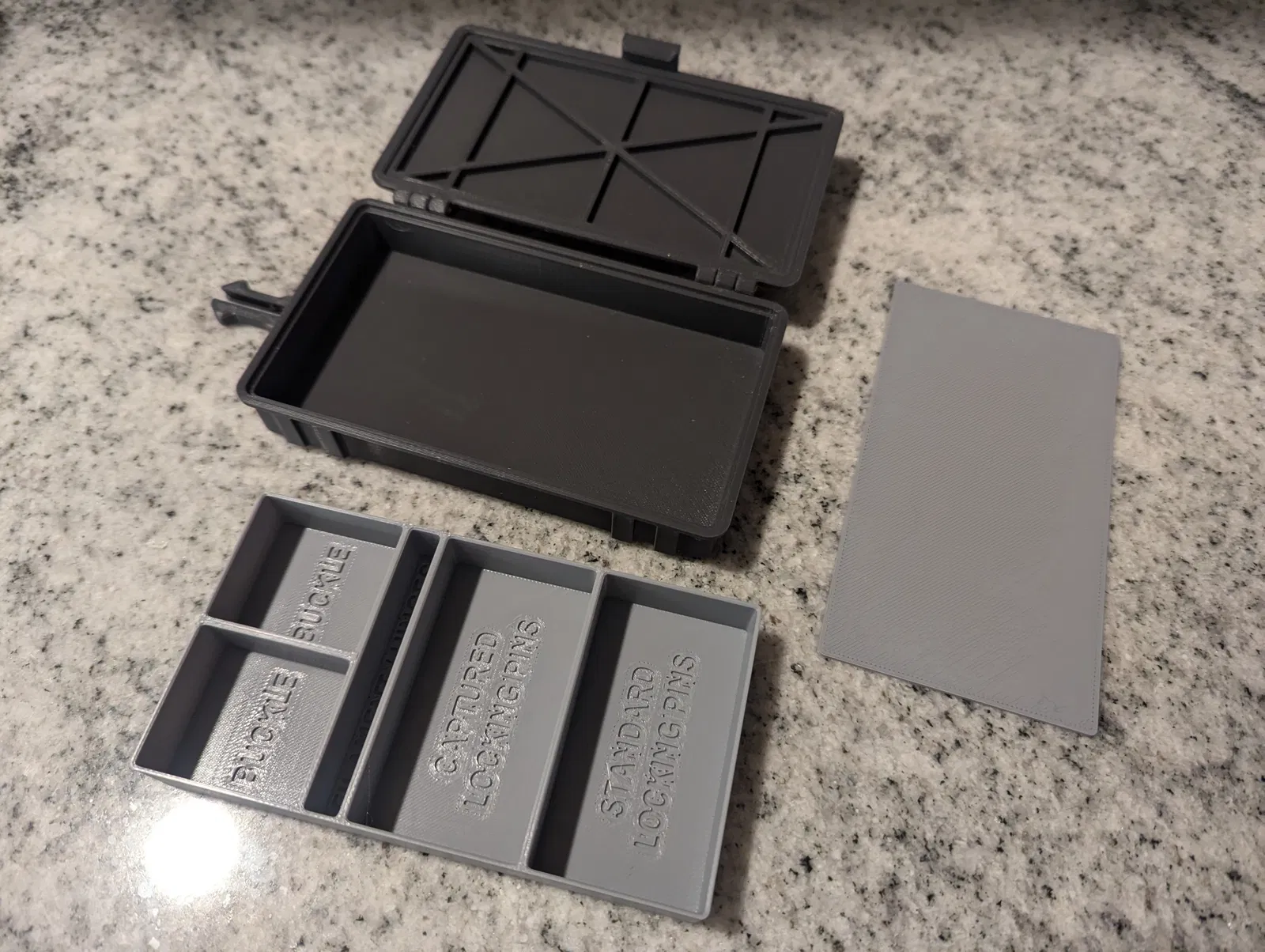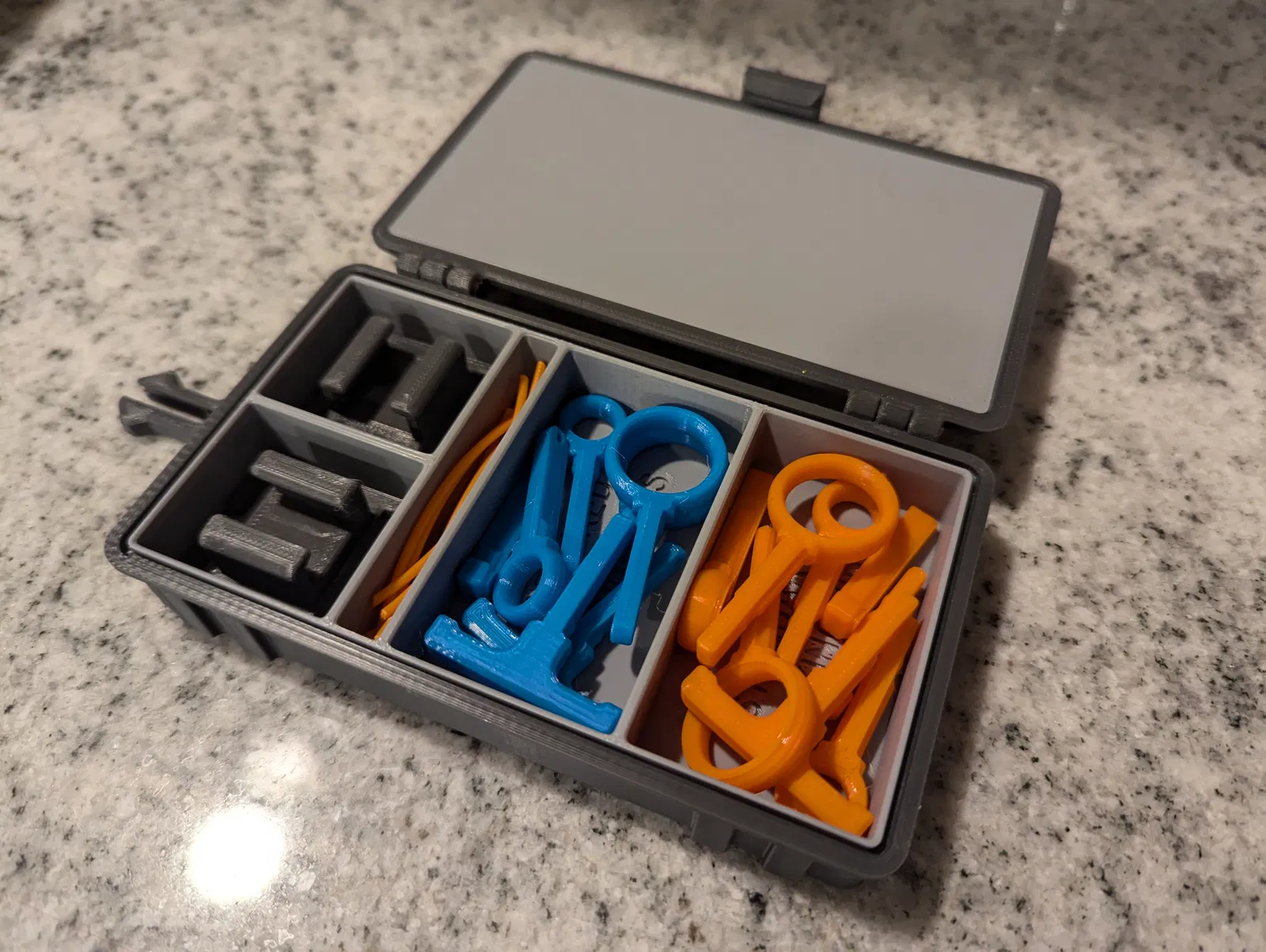 Để đóng hộp đã lắp ráp, chỉ cần ấn hai vỏ lại với nhau, cho đến khi nó đóng lại kêu tách. Để mở, kéo nhẹ vào lẫy giữ ở phía đối diện với bản lề trong khi kéo lên. Lẫy được thiết kế để vừa khít, đảm bảo đồ đạc của bạn không bị rơi ra ngoài ý muốn. Nếu bạn muốn lỏng hơn, bạn có thể chà nhám hoặc giũa điểm bên trong của lẫy, nơi nó tiếp xúc với vỏ đế.