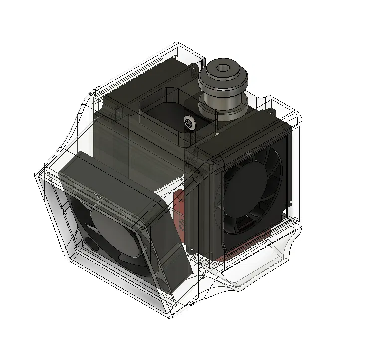 2. Mình chế ra một phiên bản cứng cáp dùng 2 cái quạt zin (hotend + part), chạy ok nhưng mà mình muốn có thêm tốc độ (tốc độ đó tương đương với volumetric speed nhiều hơn). Mình thiết kế một phiên bản hướng gió thẳng vô hotend (nó chạy ok nhưng gió bị xì xuống dưới và mình không in được ABS với máy mở (ừ, mình làm vậy đó và nó CHẠY RẤT TỐT)).