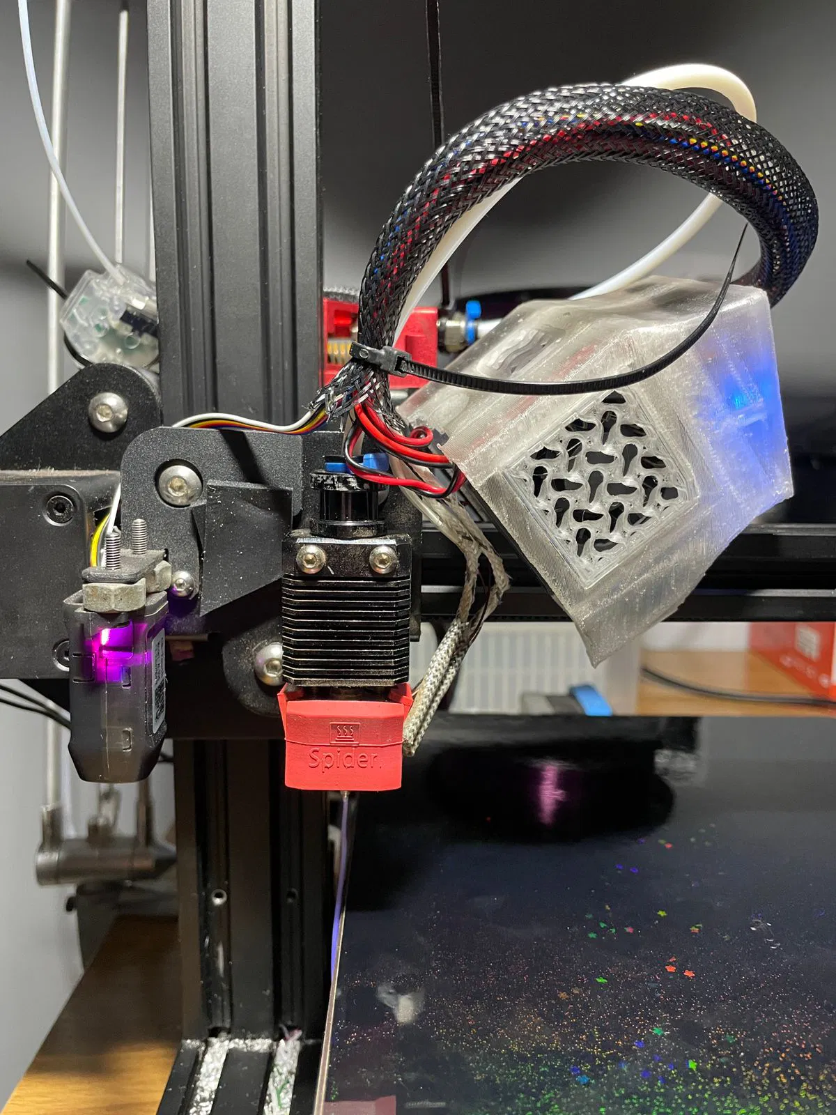 1. Mình mua cái hotend spider này của Creality, trên mạng ít thông tin lắm. Mình thử gắn vô máy in thì dây tóc nó cứ bị kẹt hoài. Mình nghĩ: chắc là do làm mát (mình đúng);