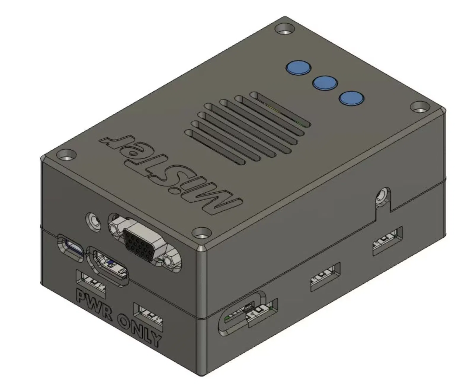 Chiếc vỏ case nhỏ gọn dành cho MiSTer Pi này bao gồm nắp, đáy và nút bấm. Hướng dẫn lắp ráp chi tiết và các vật liệu cần thiết được cung cấp, cùng với video minh họa. Nhớ in 3 nút bấm và thêm support cho các chi tiết như lỗ VGA và cổng USB.