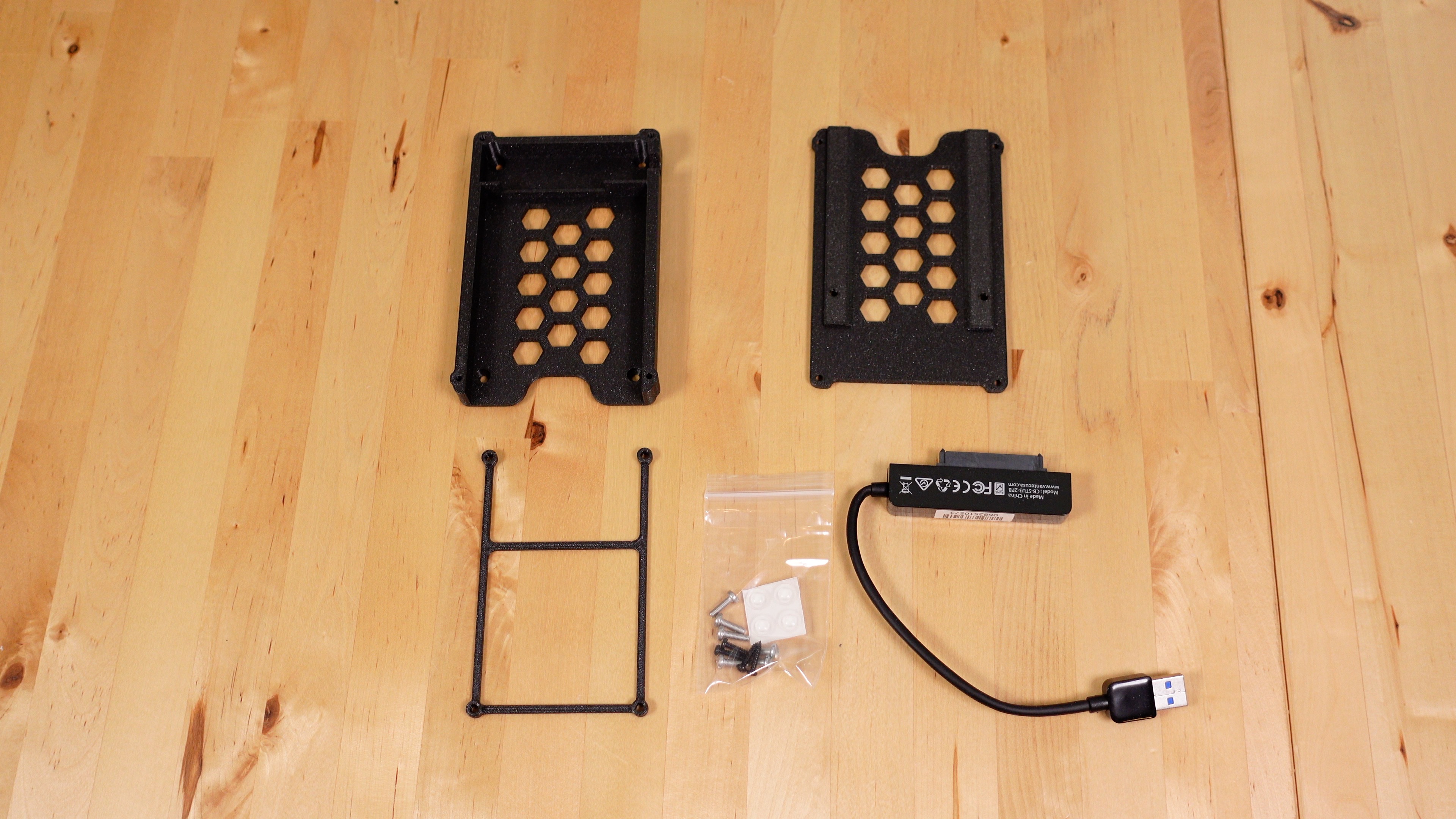 Gắn adapter USB sang SATA vào, rồi gắn 4 con ốc m2.6 vào đáy để cố định cụm lại. Gắn 4 cái chân cao su vào đáy. Còn có 2 con ốc m3 x 6mm đi xuyên qua đáy vỏ để cố định ổ cứng hoặc SSD khỏi bị bung ra.
