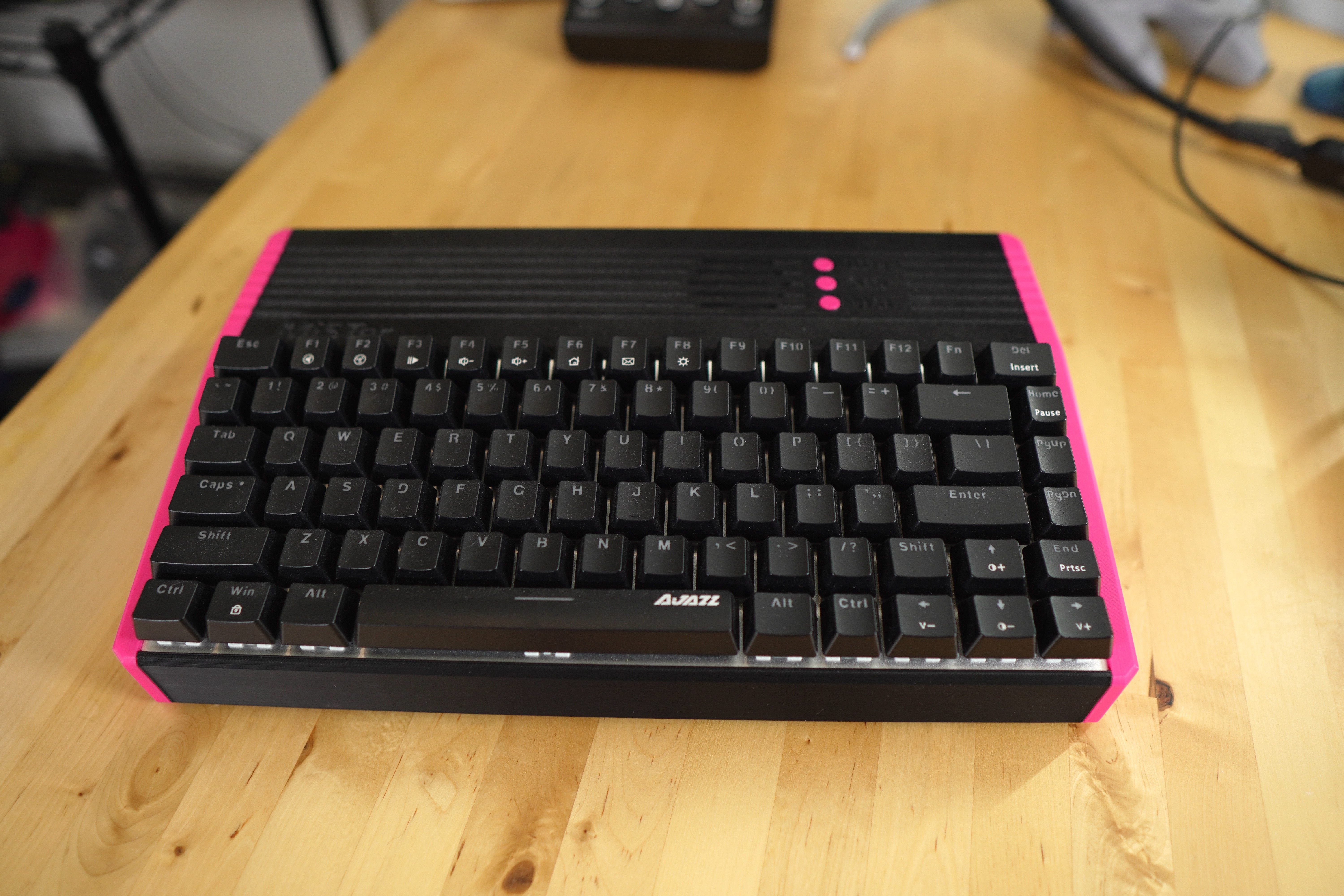 Bàn phím Ajazz AK33 cần được tháo ra khỏi vỏ nhựa của nó. Có 8 hoặc 9 con vít nhỏ dưới một số phím giữ nó đúng vị trí. Cắm cáp USB của bàn phím vào hub USB MiSTer trước khi lắp bàn phím vào vỏ máy. Bàn phím được căn chỉnh vào rãnh ở phía trước vỏ máy và các miếng bên được kẹp cùng với phần dưới của vỏ máy để giữ chặt. Sau đó, bạn sử dụng 10 vít đầu lục giác chìm M3 để giữ mọi thứ lại với nhau. Sau khi tất cả các vít được lắp đặt, toàn bộ vỏ máy sẽ rất chắc chắn do cách mọi thứ được kẹp lại với nhau và tấm kim loại lớn từ bàn phím.