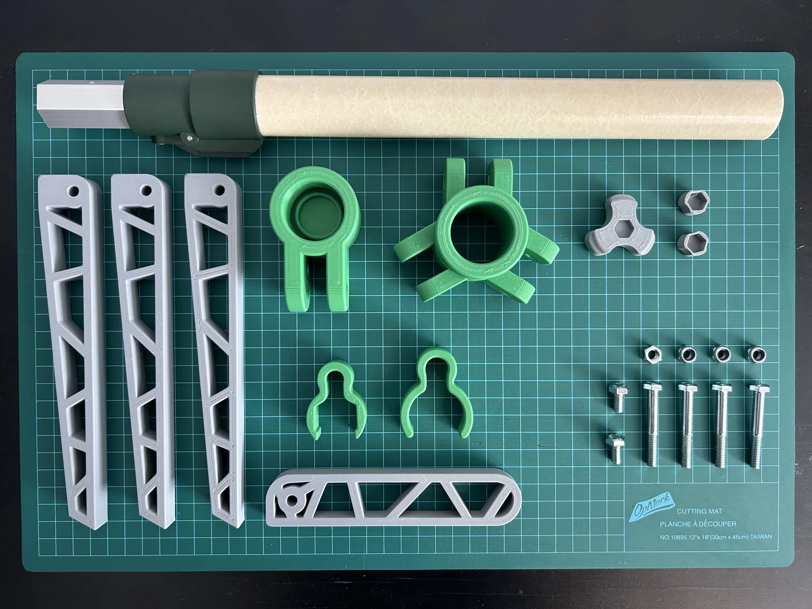 Cổ xoay chân máy là bộ phận in liền hai mảnh. Phần bên ngoài xoay quanh phần đế. Có độ lệch lớn cho các máy in chưa được căn chỉnh tốt. Đối với cổ xoay chân máy, sử dụng ba (3) ốc M6 45mm cho các chân; các ốc này có phần thân trơn để các chân xoay trên đó. Cơ chế khóa sử dụng một (1) ốc M6 12mm, gắn nắp chụp vào đầu lục giác của ốc (không cần keo, chỉ cần ép chặt). Đối với đai ốc, sử dụng ba (3) đai ốc khóa M6. Tùy chọn, cắt phần thừa của ốc bằng Dremel hoặc dụng cụ tương tự. Đối với cánh tay định hướng, sử dụng một (1) ốc M6 45mm và một đai ốc M6 tiêu chuẩn. Gắn núm vặn lớn vào đầu lục giác của ốc (không cần keo, chỉ cần ép chặt). Các kẹp dây đủ dùng cho cáp 10mm.