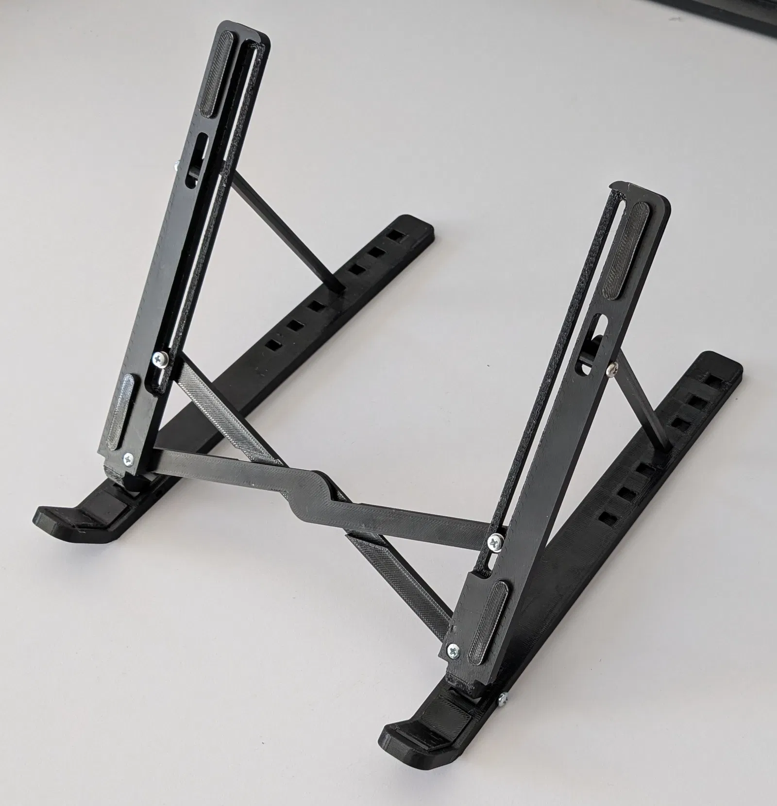 In bằng PETG và TPU với thông số chuẩn: chiều cao lớp 0.2mm, đầu phun 0.4mm và 35% mật độ ruột. Có thêm support cho lỗ khoét lớn ở phần đặt laptop và các bộ phận chống trượt bằng TPU. Bạn vẫn có thể in mẫu này trên máy in mini, chỉ cần xoay tất cả các bộ phận 45°.