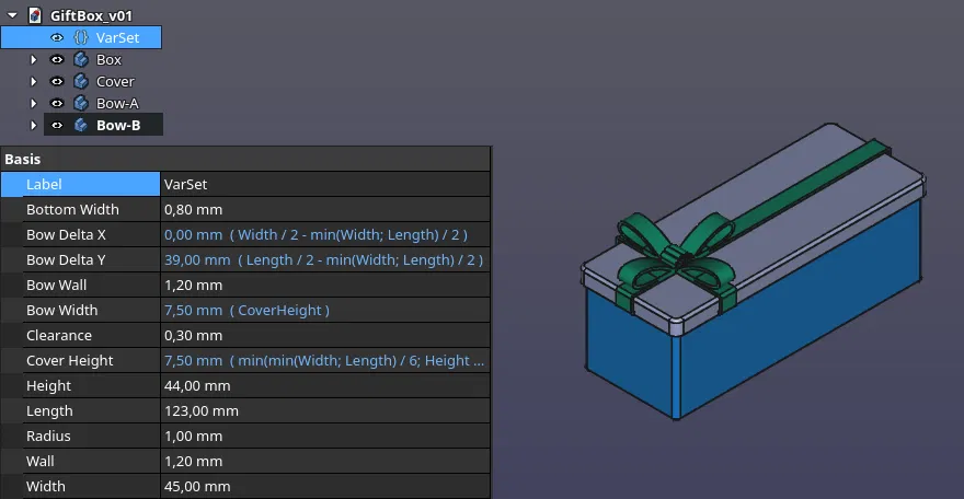 Để chỉnh sửa mẫu, bạn cần FreeCAD 1.0 (https://www.freecad.org/downloads.php) và ở đây bạn có thể chỉnh sửa tất cả các giá trị trong “VarSet”. Để xuất mẫu cho slicer sử dụng, bạn phải chọn tất cả các đối tượng cần thiết (“Box”, “Cover”, “Bow-A” và “Bow-B”) sau đó bấm File → Export… và chọn định dạng .3mf.