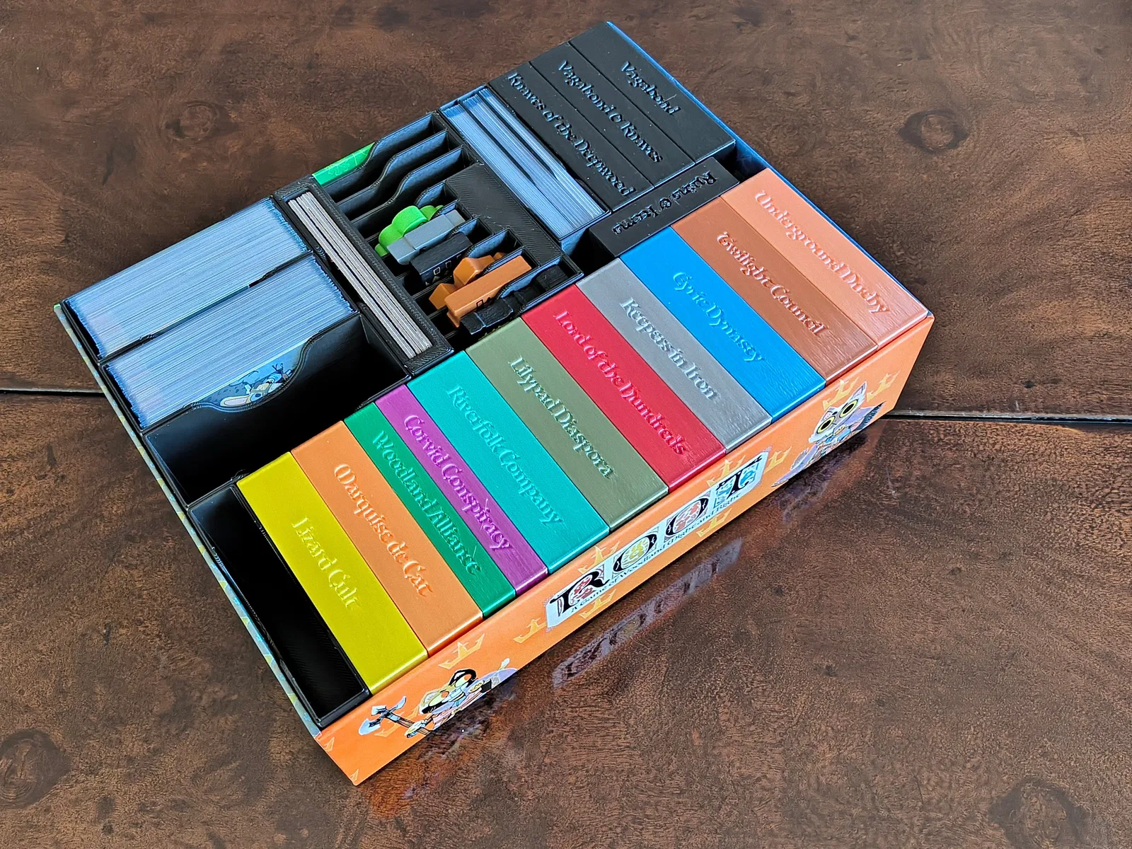 Thật không may, các thẻ có bao bọc và các hộp trên gáy (để dễ dàng truy cập và hiển thị nhãn) có nghĩa là sẽ có khoảng 4mm nắp hộp bị nâng lên. Tui không thích điều này lắm, nhưng không có cách nào khác nếu không đặt các hộp nằm ngang. Các hộp được đặt kích thước sao cho có thể nằm ngang theo các chồng 3 hộp cỡ vừa (ví dụ: Cat/Lizard/Badger) và 2 hộp cỡ lớn cộng 2 hộp cỡ nhỏ (ví dụ: Rat/Mole/Alliance/Crow). Nếu bạn thích các hộp phe phái nhưng không thể chấp nhận việc nắp hộp bị nâng lên, bạn có thể làm vậy và tự tìm giải pháp cho các thành phần còn lại.