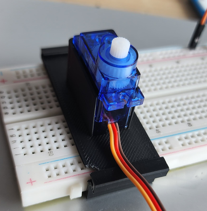 Một trong các servo chịu trách nhiệm chuyển động ngang - đây là servo gắn vào đế của bảng mạch mẫu.