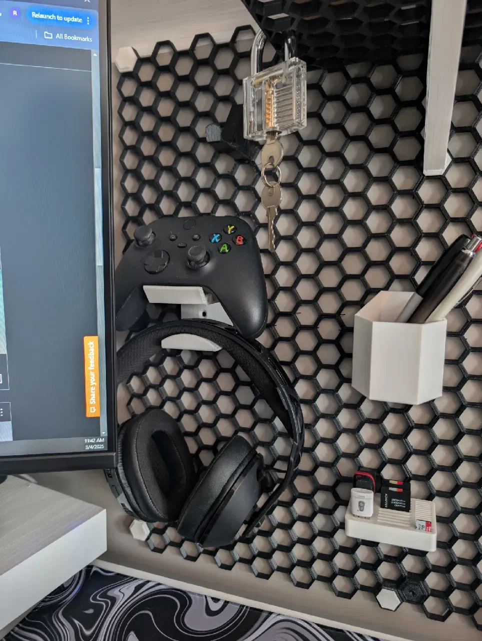 Cái giá đỡ tai nghe và tay cầm này dành riêng cho hệ thống Honeycomb Storage Wall (HSW). Đây là bản remix từ thiết kế gốc của SEARS, mang đến giải pháp lưu trữ gọn gàng và tiện lợi cho các thiết bị chơi game của bạn trên tường.