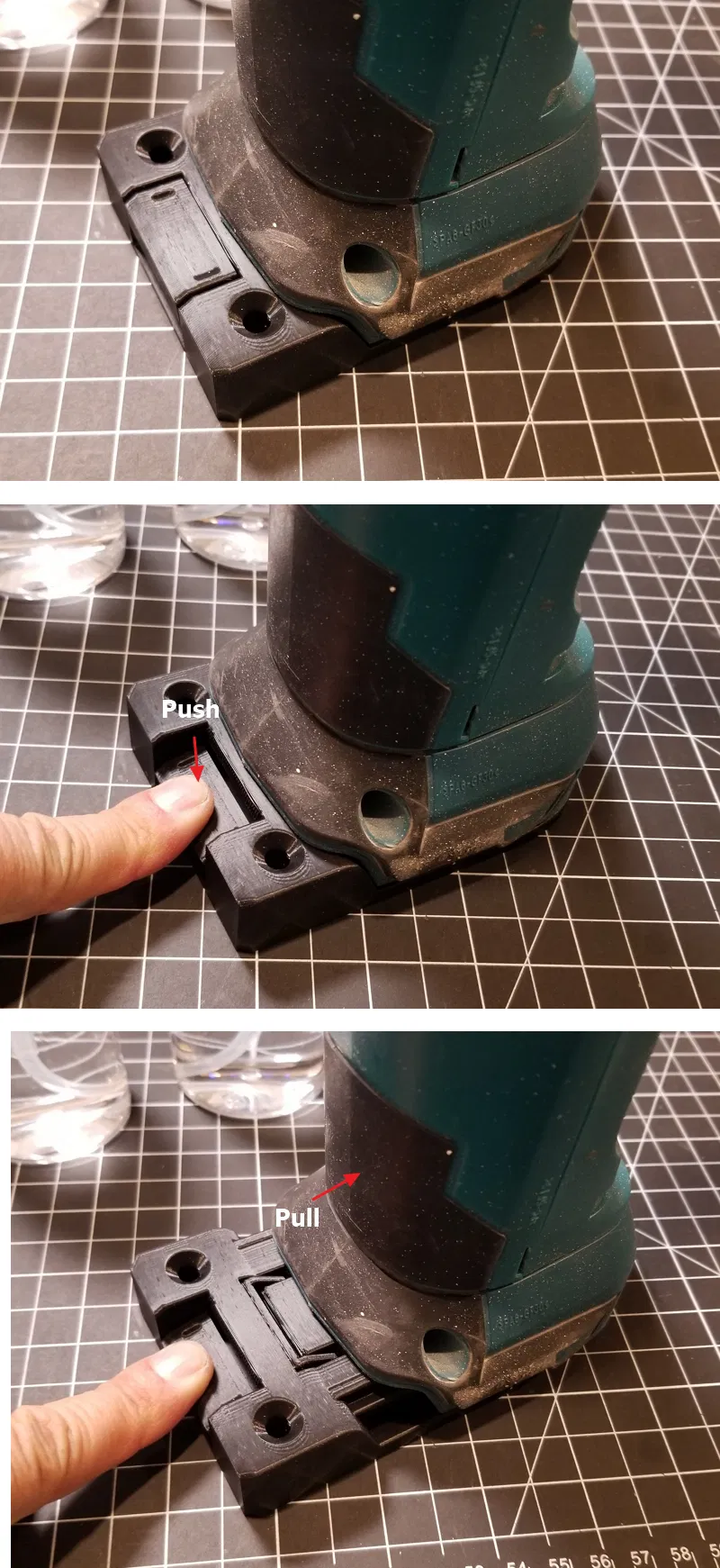 Mình đã bao gồm 2 phiên bản (cho đến nay) - một phiên bản có cả khóa được kích hoạt bằng nút bấm, tương tự như pin thật - bạn chỉ cần bấm dụng cụ vào để khớp và sẽ nghe thấy tiếng "cạch" đã tai. Phiên bản còn lại cho phép dụng cụ chỉ cần trượt vào và không có khóa hay nút bấm. Tùy bạn chọn.
