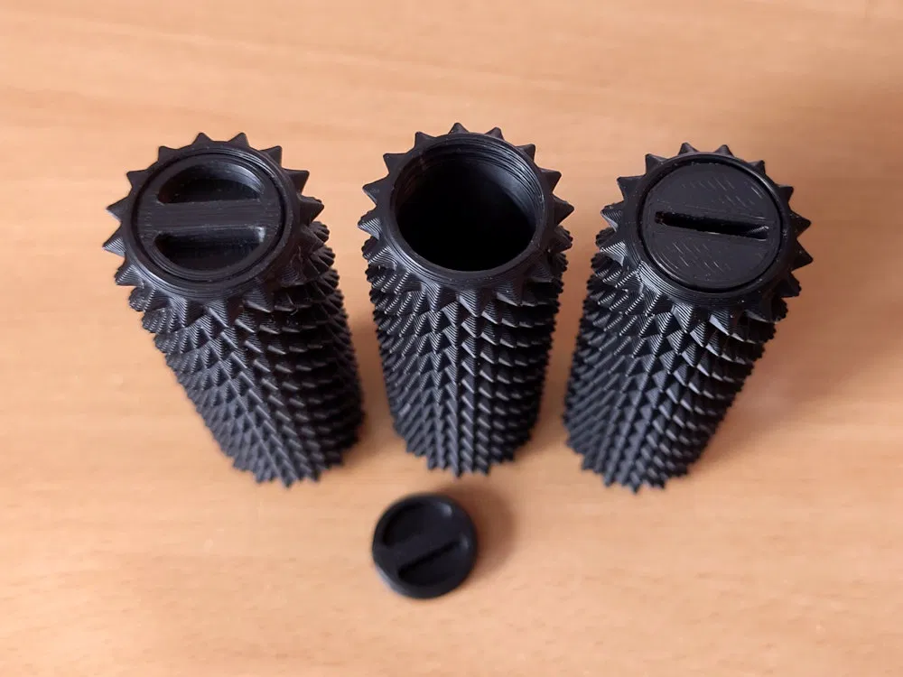Lấy cảm hứng từ một video giới thiệu một ống trụ có gai ("Ouchie") dùng để tạo cảm giác đau nhẹ, mà thật ra lại giúp tập trung tốt hơn trong một số trường hợp (như ADHD), tui muốn nhanh chóng thiết kế một món đồ tương tự (nhưng với gai hình lục giác) để thử xem sao. Tui có cho bạn bè xem thử và có hai người liền muốn có một cái, rồi còn có người gợi ý thêm cái "clicky" vô nữa - . Nhưng tui cũng thiết kế phiên bản này để tận dụng không gian bên trong làm hộp nhỏ.