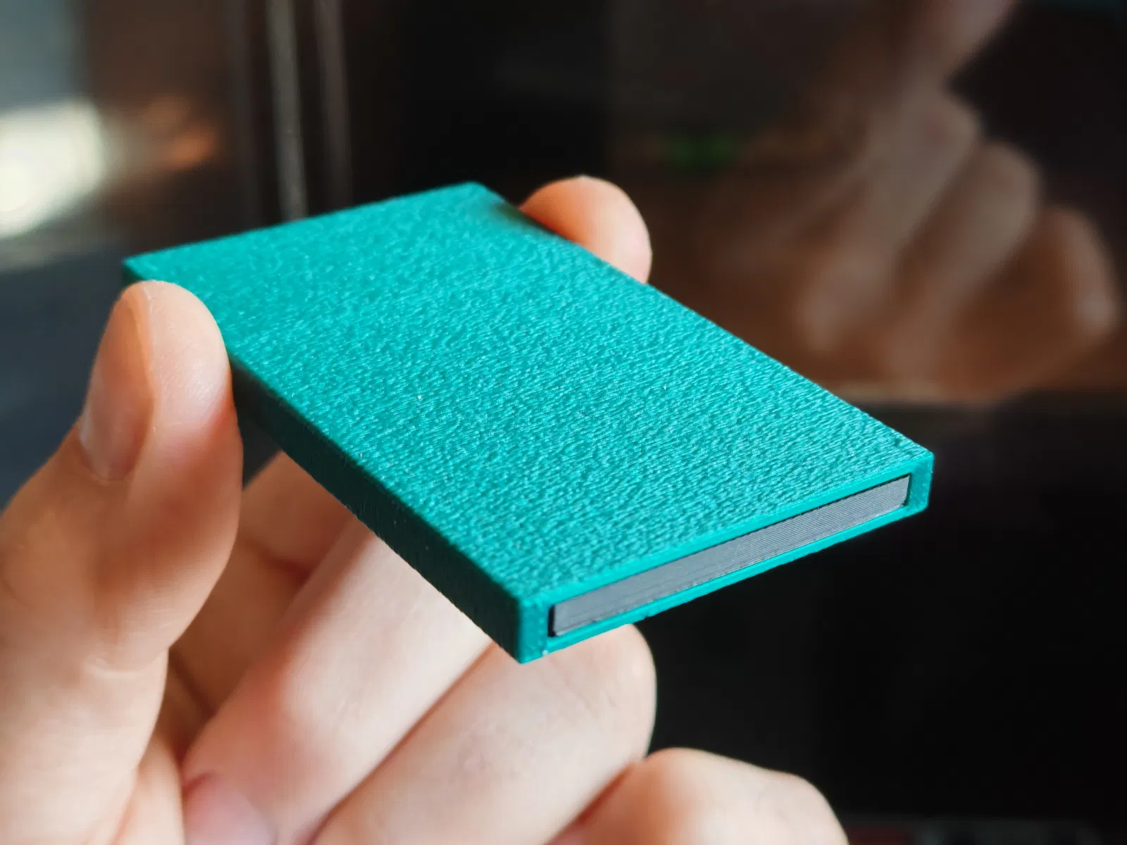 Trông đẹp hơn khi in bằng fuzzy skin 0.2/0.1 cho cái hộp. Có thể in bằng bất kỳ loại nhựa nào như PLA, ASA hay PETG.