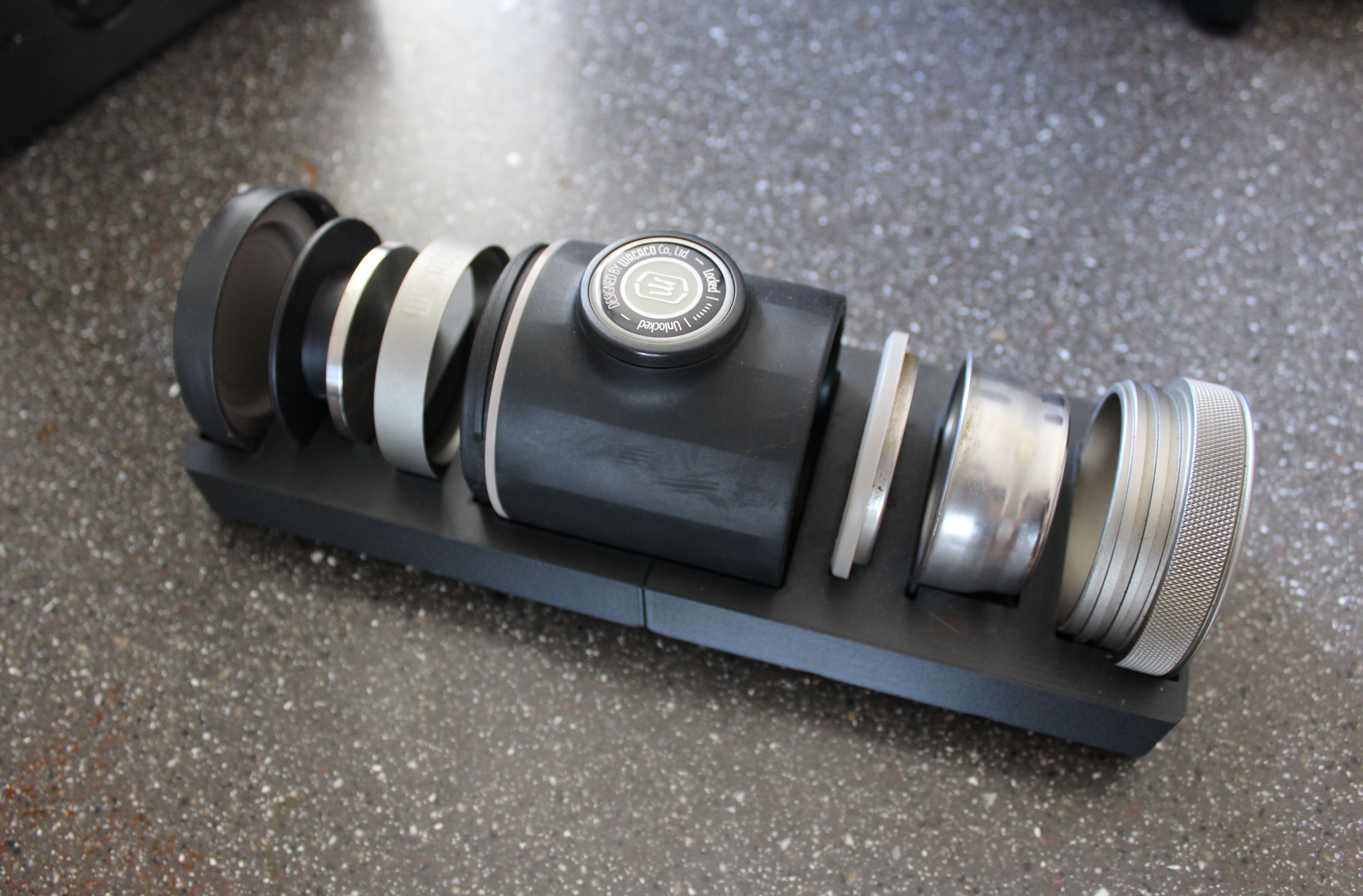 Một khối Gridfinity dùng để cất giữ máy pha cà phê espresso cầm tay Picopresso ở trạng thái mở rộng, giúp bảo quản và tiết kiệm không gian.