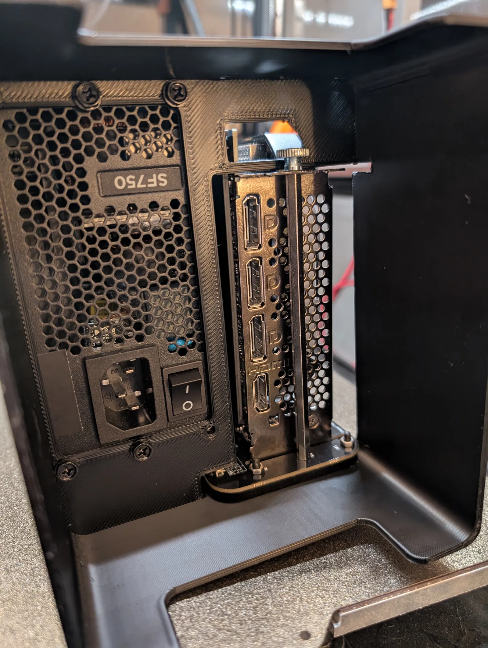 Giá đỡ đơn giản cho bộ nguồn SFX và eGPU, có không gian đi dây. Đã thử nghiệm với MSI 4070 và Corsair SF750. Có thể in ngược, tương thích GPU 3 slot và chỉnh sửa chiều cao nếu cần.