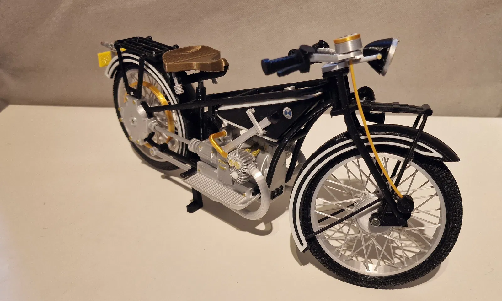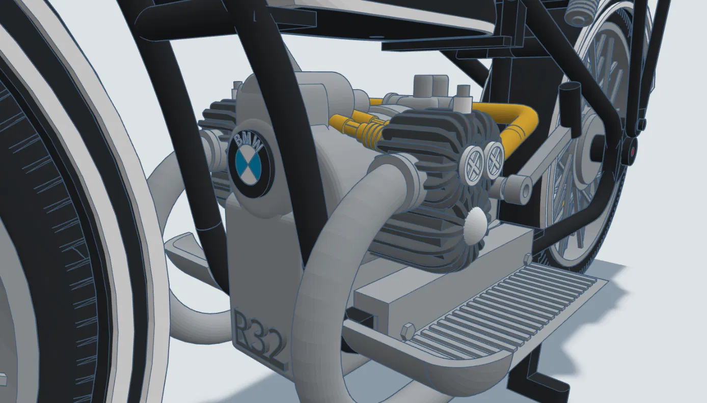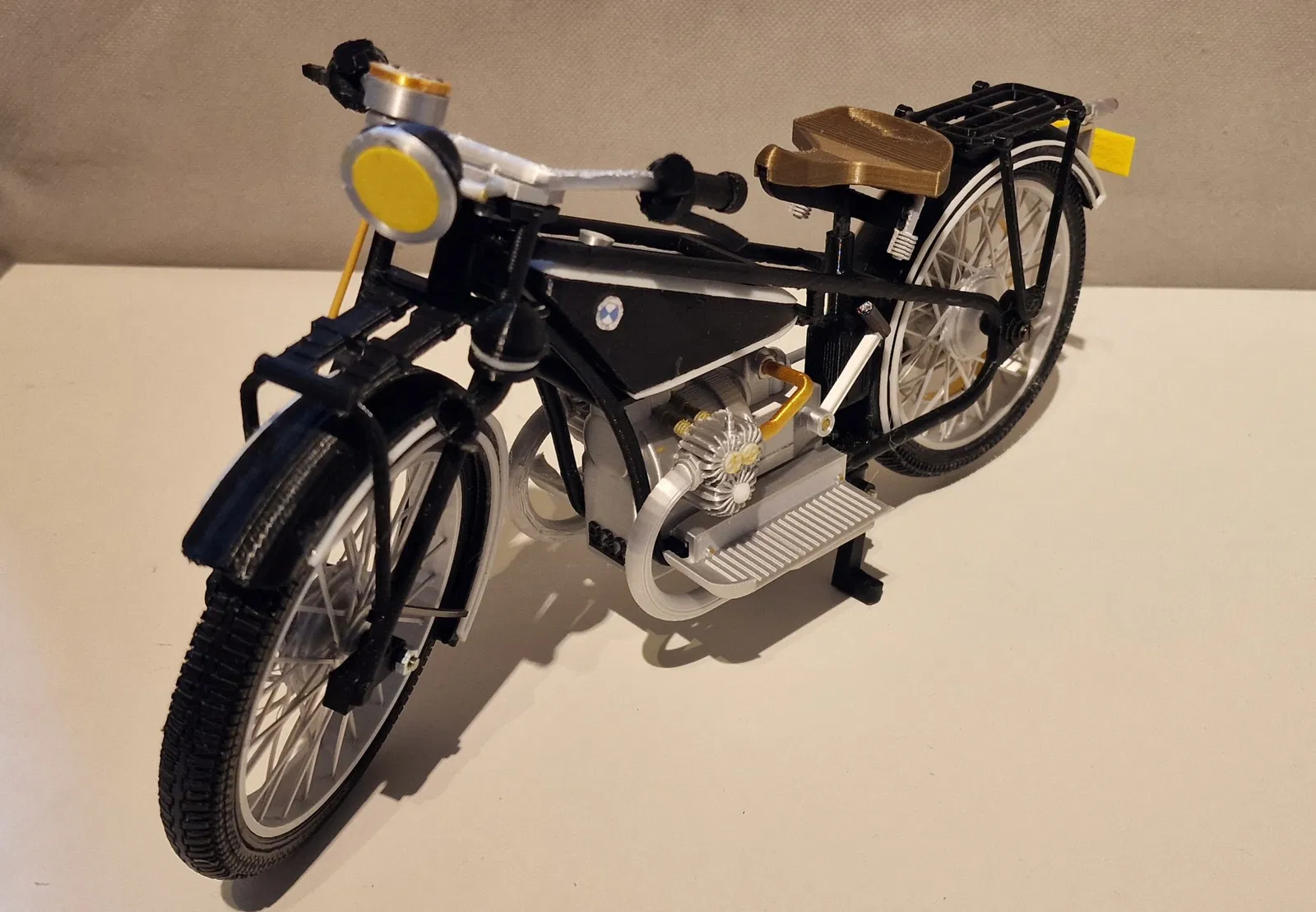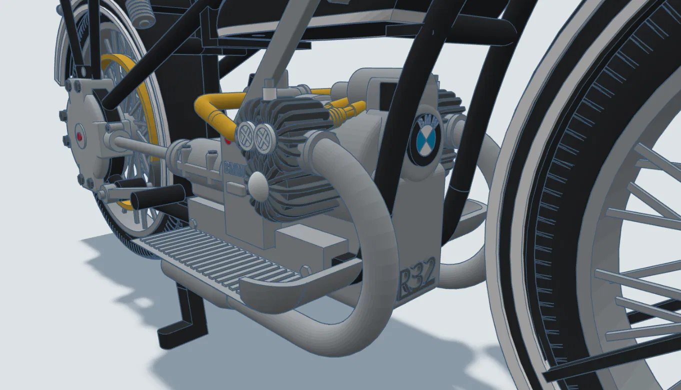 Chi tiết mô hình xe BMW R32 đời 1925, tỉ lệ 1:6,5 do nhà thiết kế Ed van der Heijden thực hiện. Mô hình này sử dụng chất liệu PLA, độ phân giải động, ruột 50% dạng đường và yêu cầu tốc độ in 60mm/s cho bộ gá. Các trục và chốt phuộc đều dùng ốc m3.