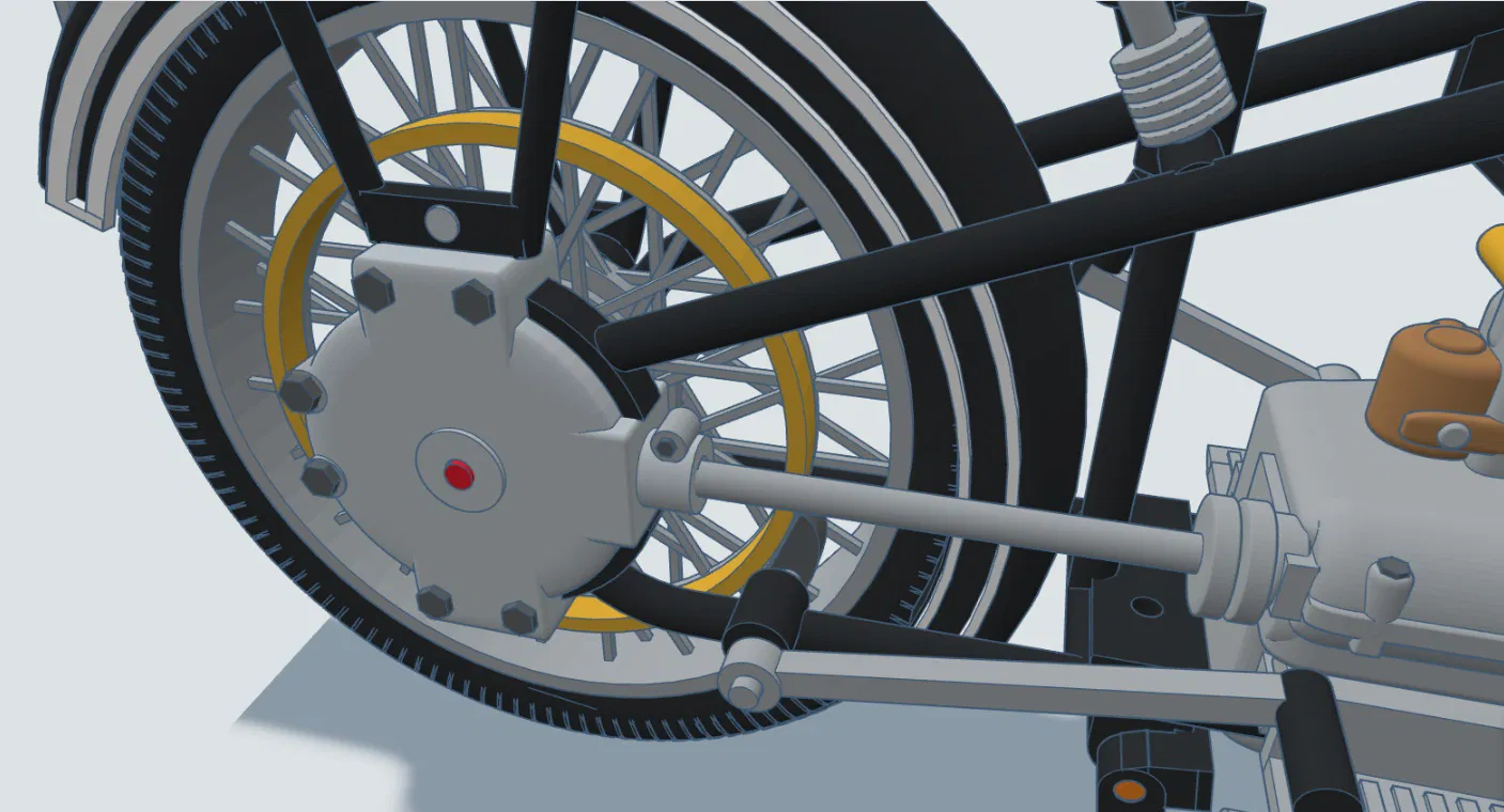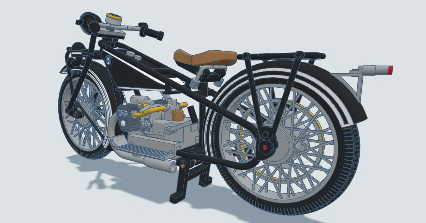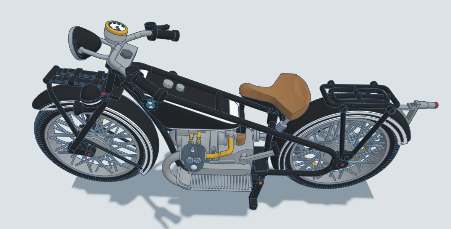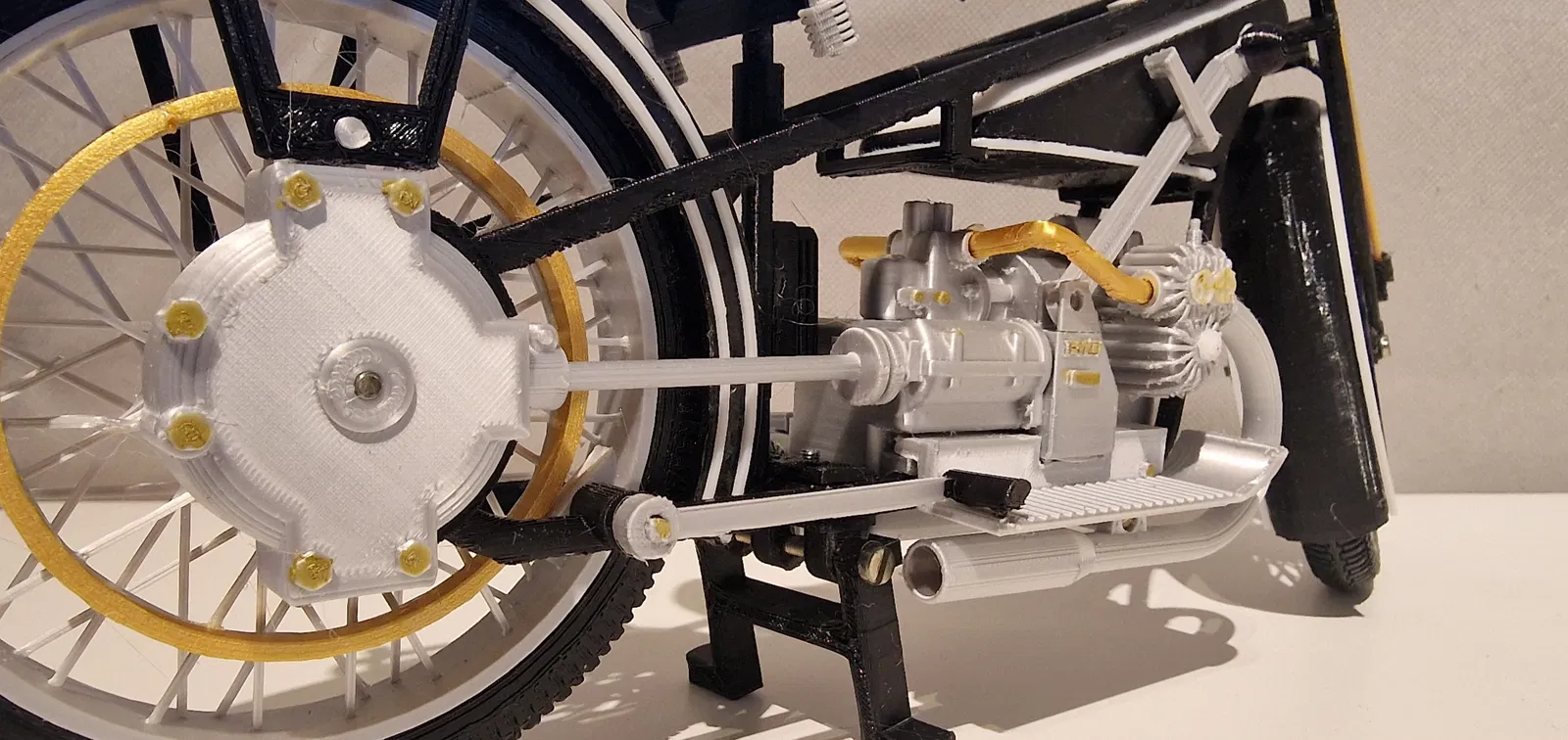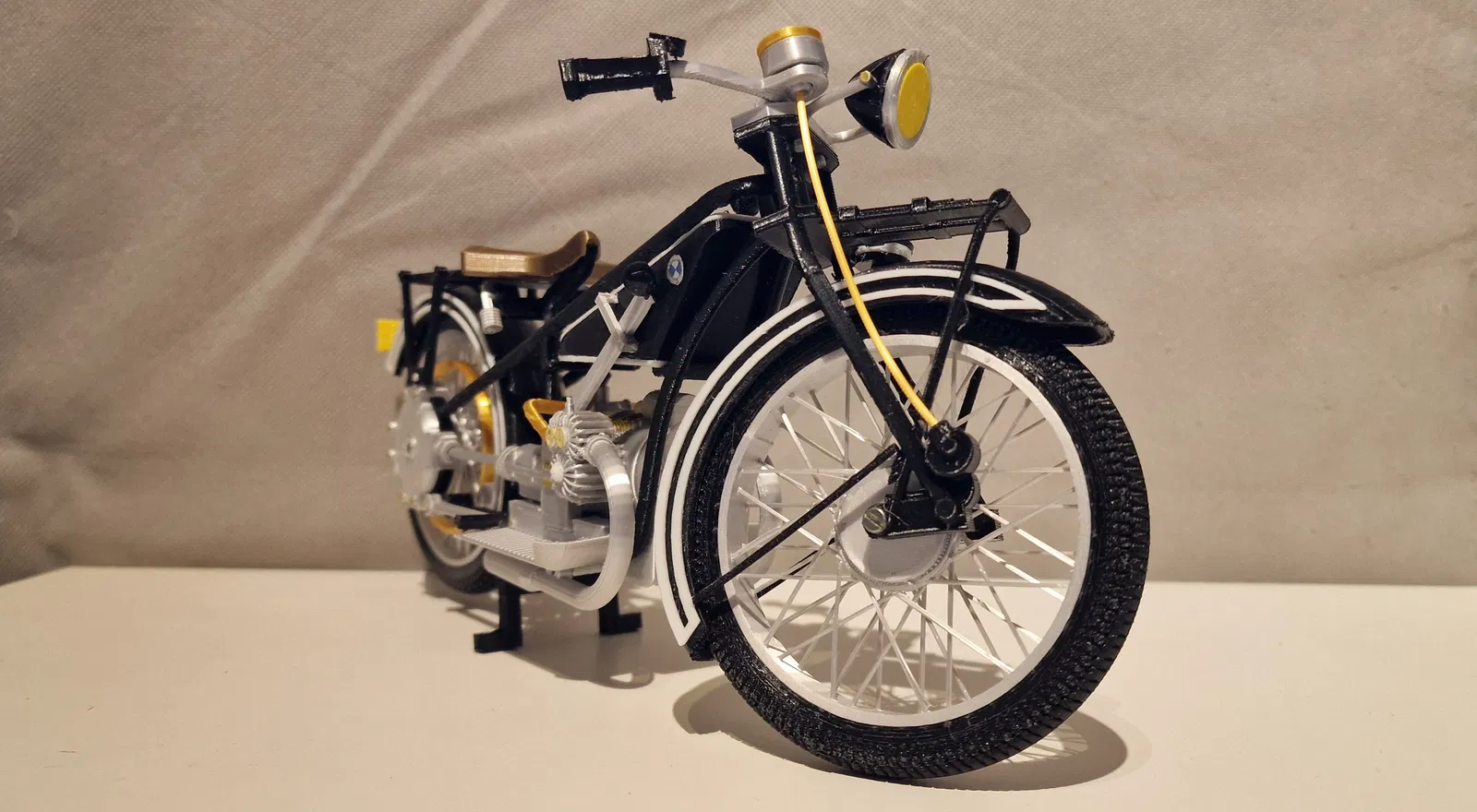 Chi tiết mô hình xe BMW R32 đời 1925, tỉ lệ 1:6,5 do nhà thiết kế Ed van der Heijden thực hiện. Mô hình này sử dụng chất liệu PLA, độ phân giải động, ruột 50% dạng đường và yêu cầu tốc độ in 60mm/s cho bộ gá. Các trục và chốt phuộc đều dùng ốc m3.