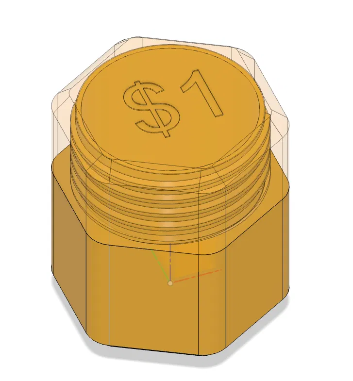 Ống đựng tiền xu hình lục giác, được tạo mô hình trong Fusion 360, sử dụng các tham số cho kích thước đồng xu.