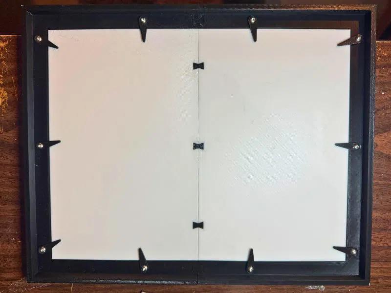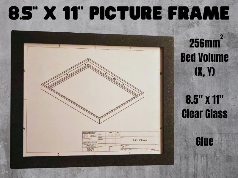 Đây là một khung ảnh cho các vật dụng có kích thước 8.5 inch x 11 inch. Đây là kích thước của một tờ giấy tiêu chuẩn. Nó cần một tấm kính/mica dày 8.5 inch x 11 inch để giữ tờ giấy bên trong. Tôi thiết kế nó để sử dụng một miếng mica dày 1.2mm.