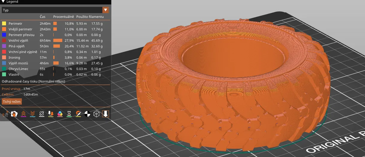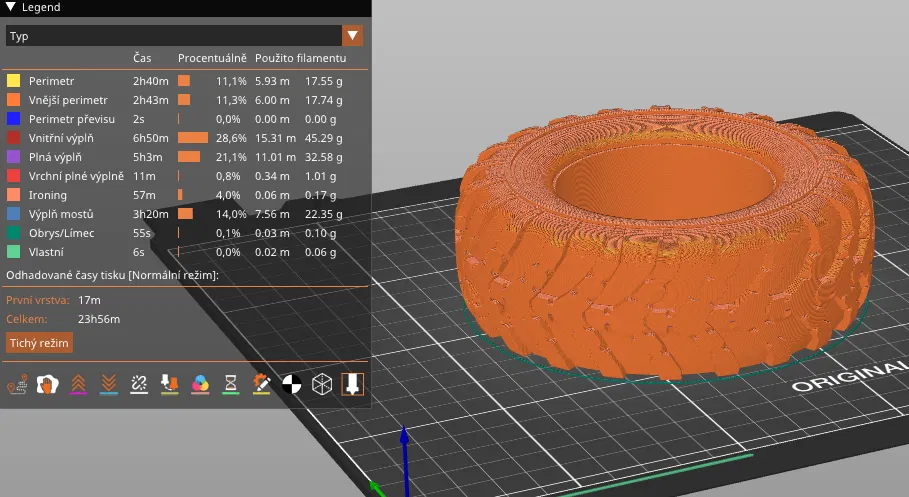 Phần trên được sửa đổi, độ điền có thể thay đổi, cầu nối, lớp trên cùng, làm mát, các loại điền, tốc độ, nhiệt độ, góc điền và nhiều hơn nữa. Rất tiếc, để loại bỏ vết nứt ở trên cùng, nhiều lớp trên cùng hơn >>> tiêu thụ vật liệu nhiều hơn (khoảng 46m / 126g sợi cho bánh xe 3 và 48m / 142g cho bánh xe 4), thời gian in khoảng 24 giờ.