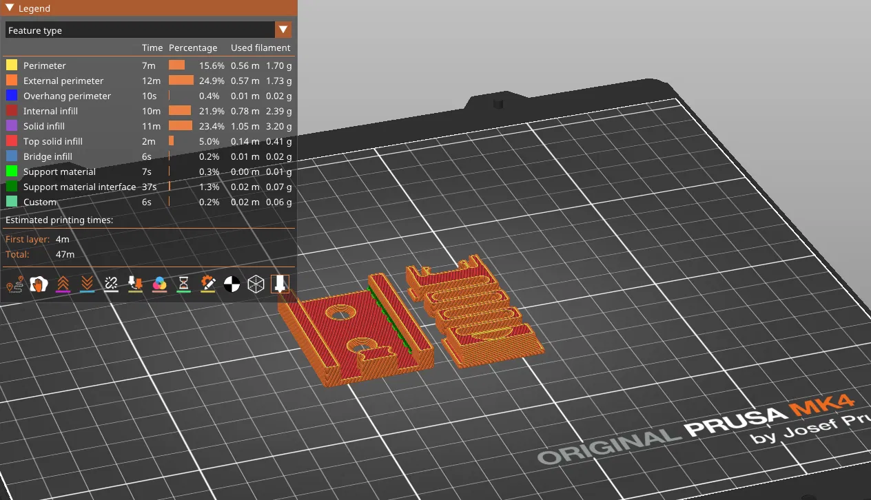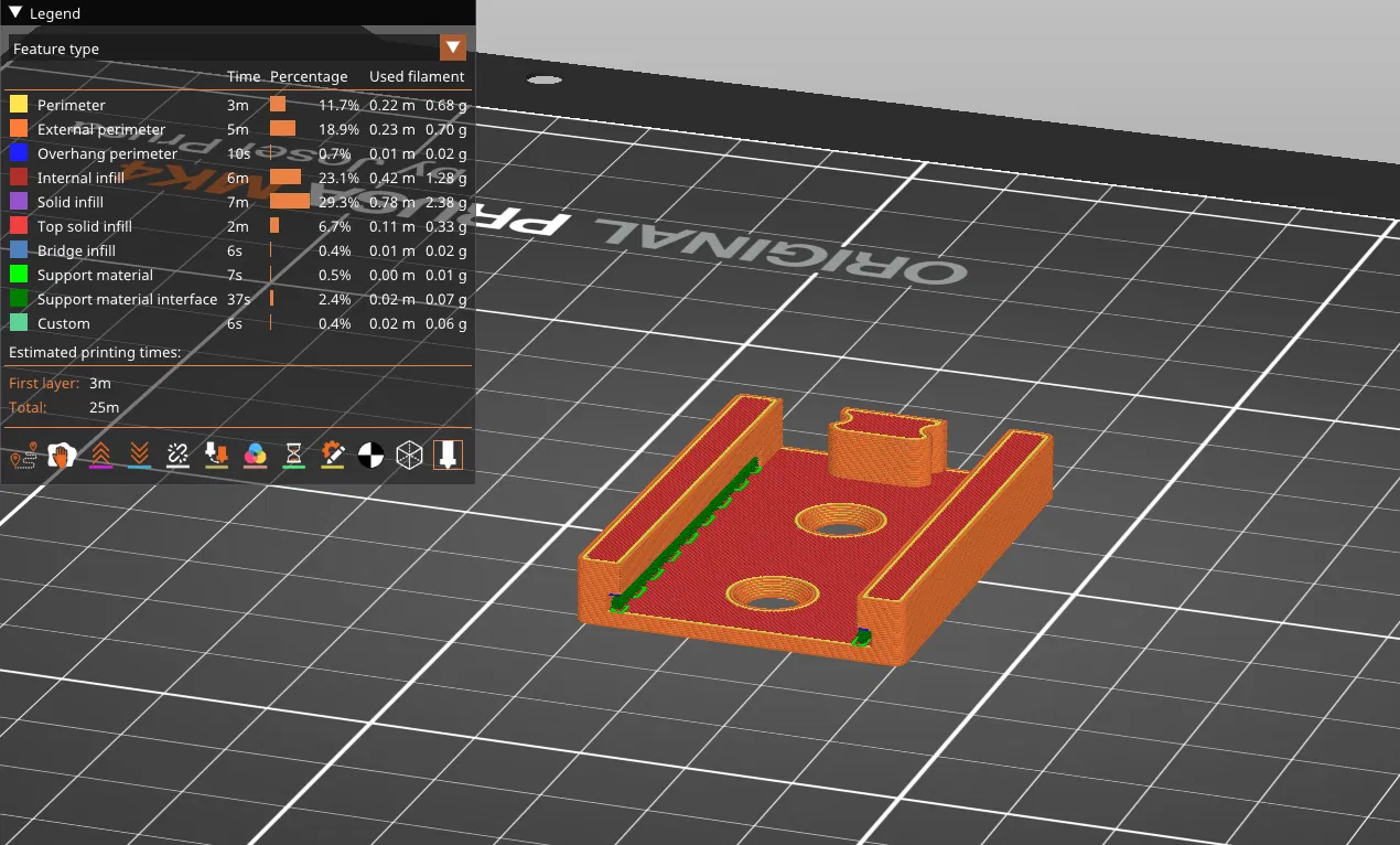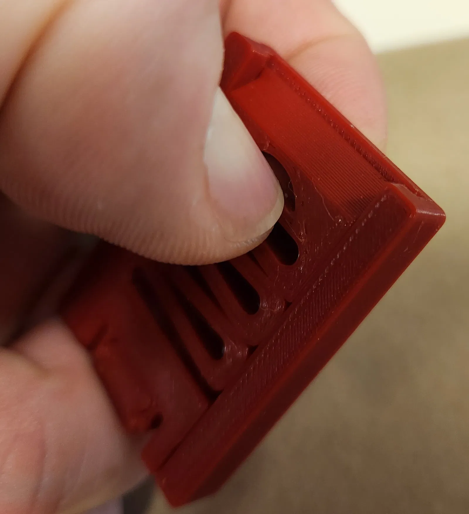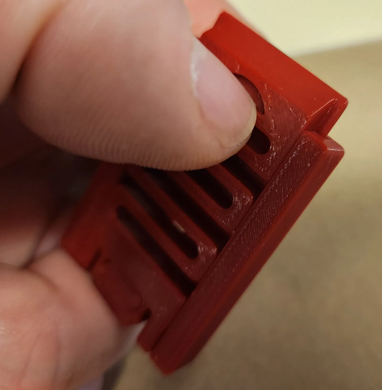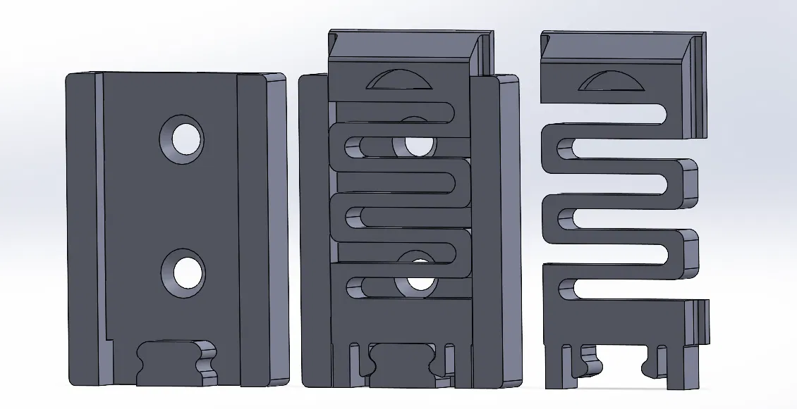 Chốt lò xo có đế để giúp giữ chặt đồ vật. Chốt lò xo và đế là hai bộ phận riêng biệt phòng khi có bộ phận bị gãy. Tôi đề nghị in 100% độ đặc ruột, ít nhất là với lò xo. Các lỗ gắn trên đế dành cho vít chìm cỡ #6. Sử dụng vật liệu hỗ trợ khi in đế nếu bạn in nó ở tư thế nằm phẳng. Phần nhô ra rộng khoảng 1.5mm và dễ dàng loại bỏ vật liệu sau đó.