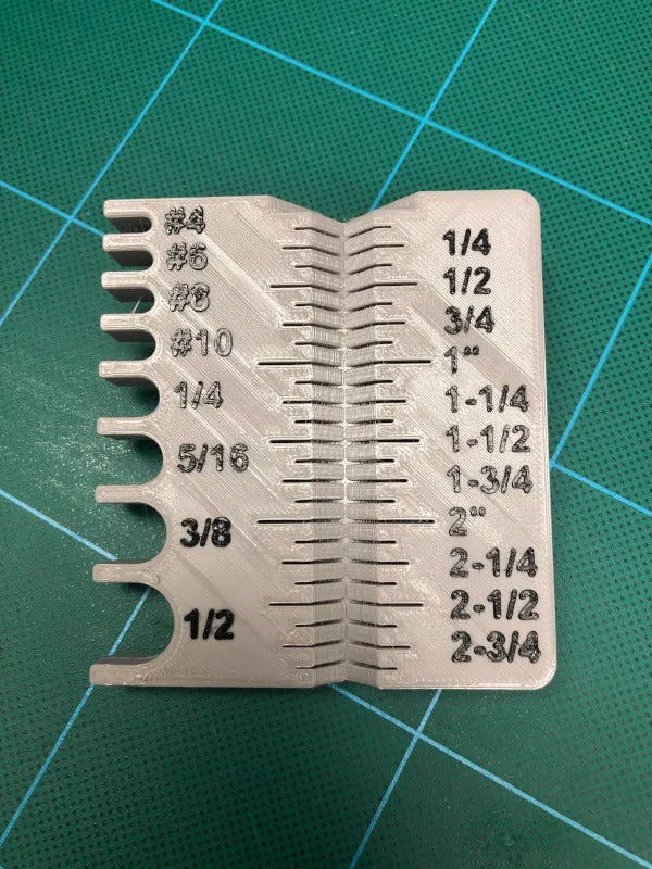 Một dụng cụ đo ren theo hệ inch/SAE để giúp phân loại hoặc đo các loại vít hoặc bu lông không rõ kích cỡ. Lấy cảm hứng từ nhiều thiết kế tương tự khác, thiết kế này có các ký tự nổi để có thể in màu khác nhau ở hai lớp trên cùng, giúp tăng độ tương phản.
