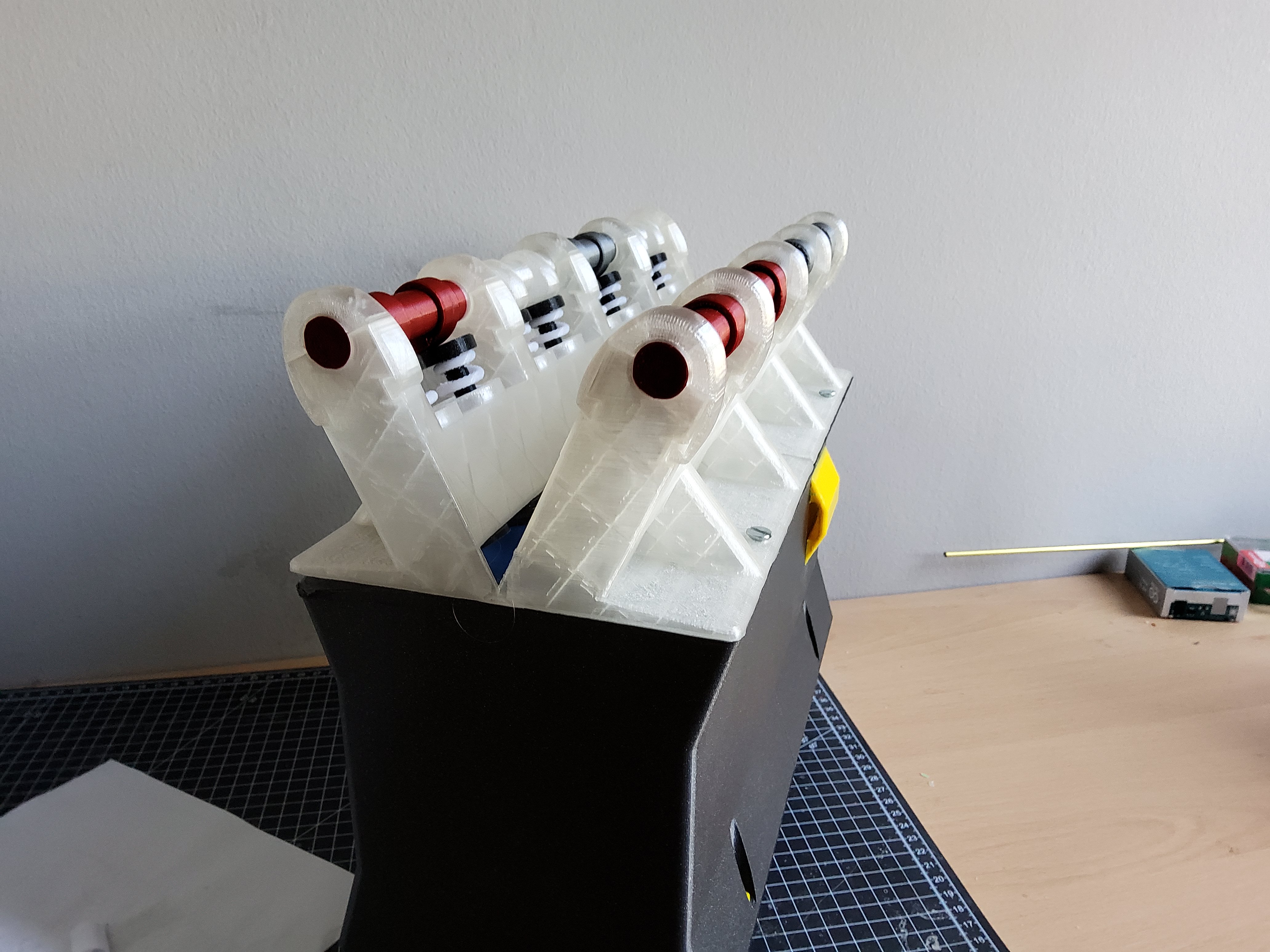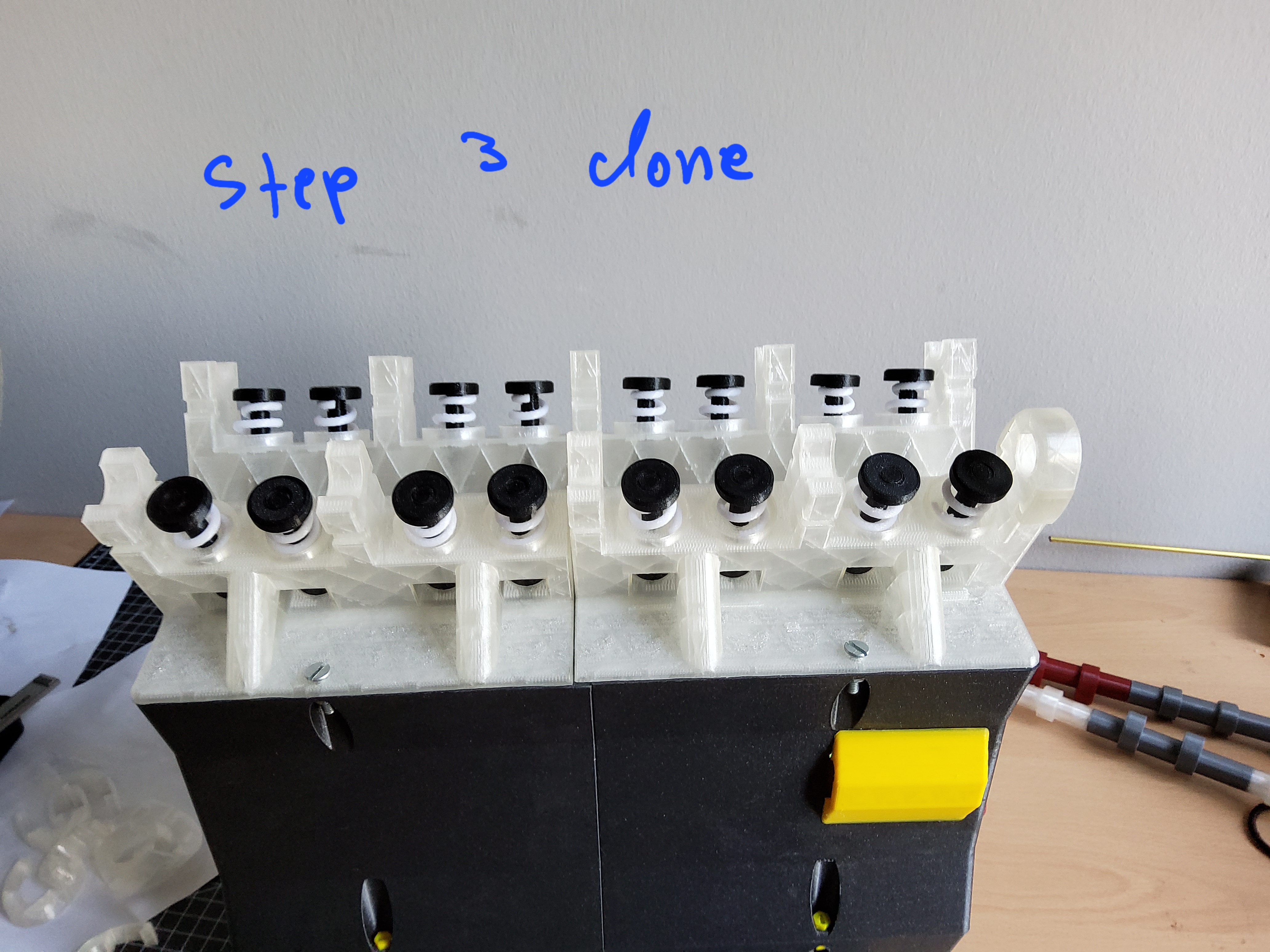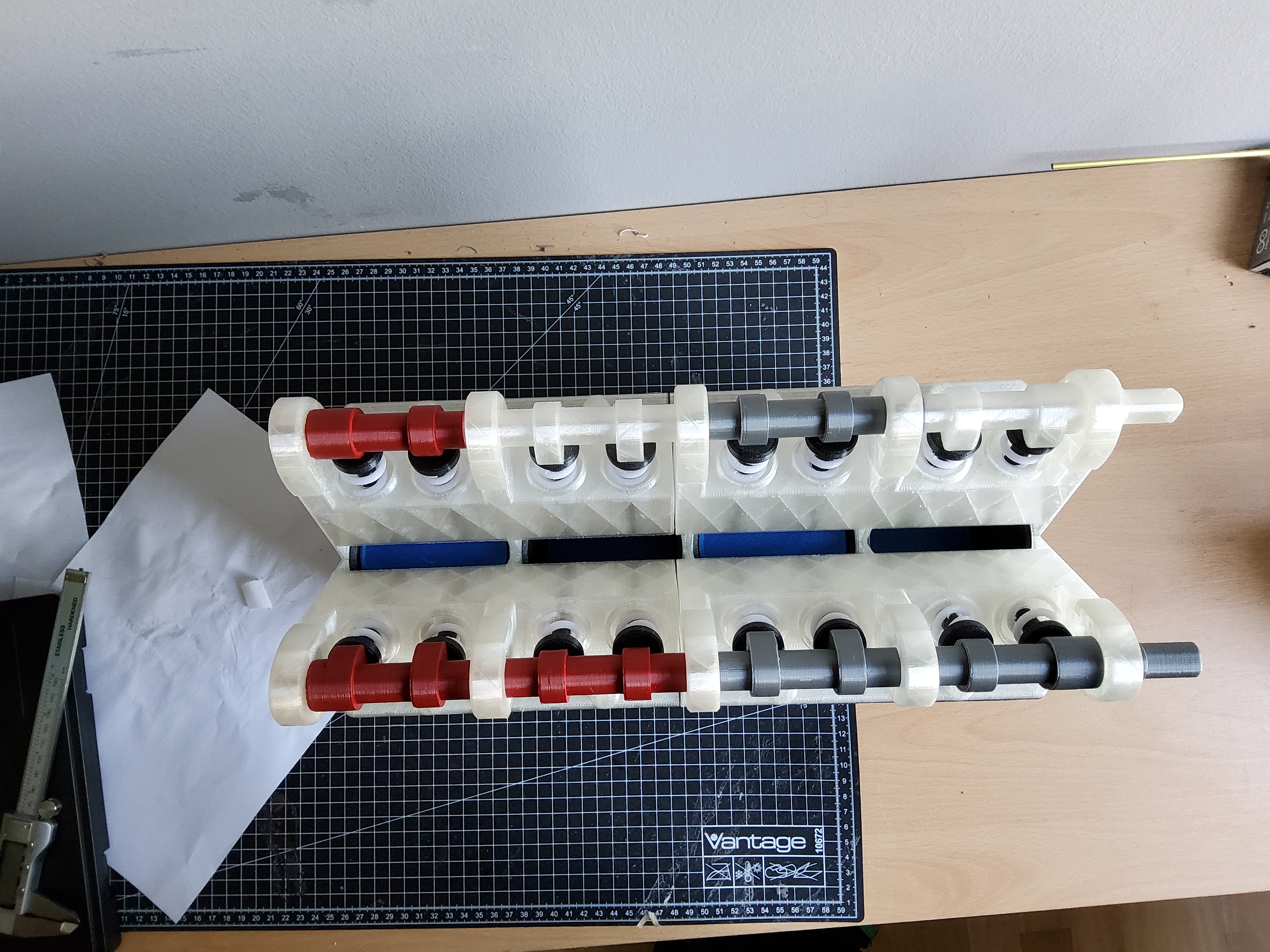 - Sau khi in xong tất cả các chi tiết, hãy kiểm tra xem chúng có khớp với nhau không bằng cách đặt "Baseplate small.stl" lên bàn, và từ phía dưới, luồn một "Valve stem (print 16 times).stl" từ dưới vào một trong những lỗ nhỏ dành cho van. Sau đó, lấy một "Valve return spring (print 16 times).stl" và đặt nó vào ổ tròn. Lò xo hồi vị có hình dạng hơi côn, phần đường kính lớn hơn của lò xo là phần đáy và khớp tốt hơn vào không gian hình tròn. Tiếp theo, lấy một "Valve top (print 16 times).stl" và vặn nó vào thân van sao cho lò xo hồi vị bị nén lại một chút, đỉnh của thân van và nắp nên ngang bằng để có một bề mặt phẳng cho trục cam di chuyển. Sau đó, lấy một trong những chi tiết "camshaft rear (print twice).stl" và đặt chúng vào phần trên của đầu xi-lanh, nửa ổ đỡ hình bán nguyệt phía dưới của trục cam. Trục cam phải quay trơn tru. Tiếp theo, lấy một trong những chi tiết "camshaft bearing top (print 10 times)" và trượt nó vào đúng khe của nó phía trên trục cam, sẽ có một chút độ rơ nhưng đế nhỏ với ổ đỡ trục cam dưới và ổ đỡ trục cam trên nên trượt vào nhau mà không cần nhiều lực. Bạn có thể kiểm tra xem tất cả các bộ phận có khớp với nhau không và so sánh với một trong những hình ảnh đã tải lên.