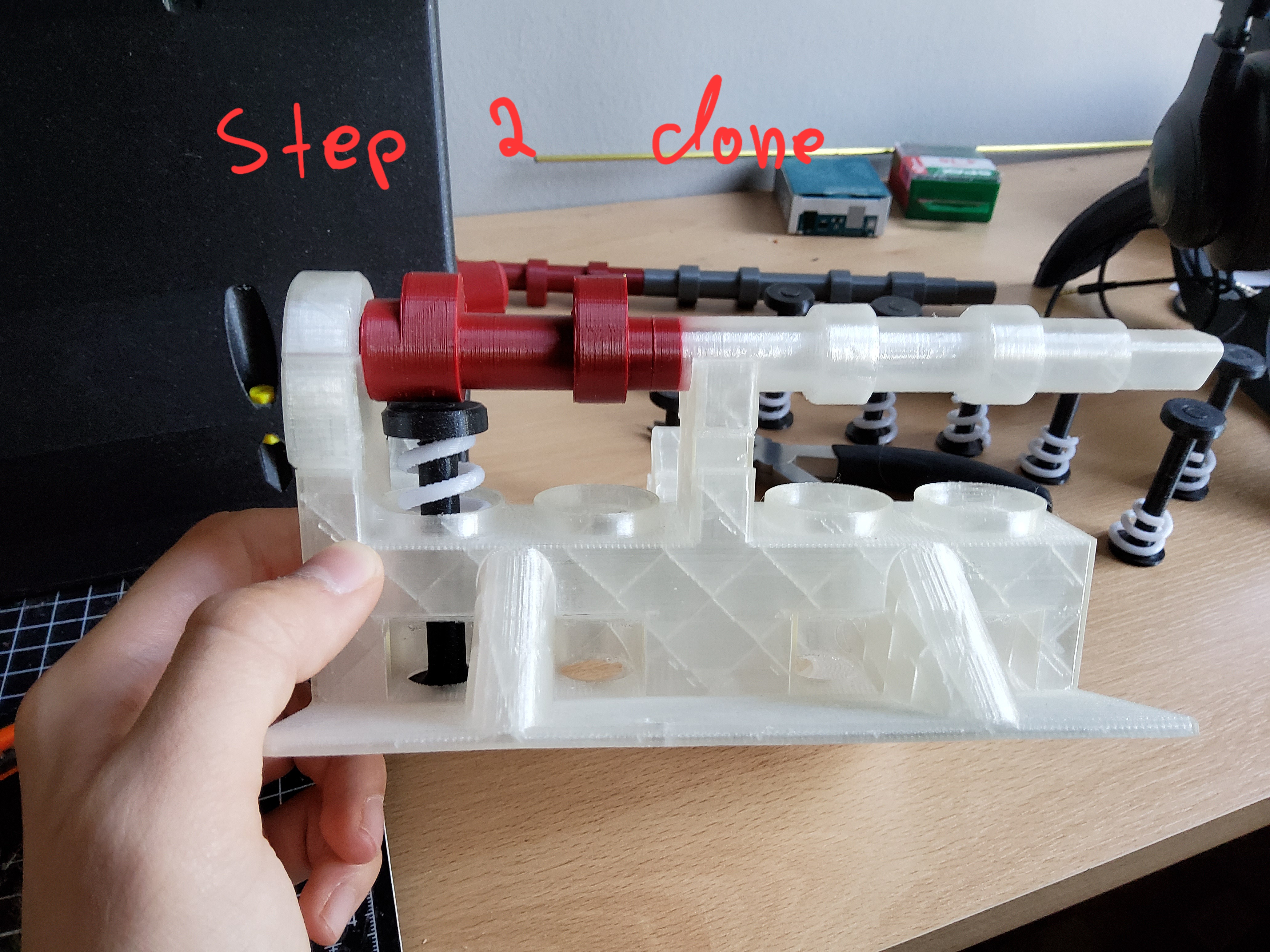 trước khi in đi in lại nhiều lần mà phát hiện ra chúng không khớp với nhau như dự kiến, hãy in thử "Valve stem.stl", "Valve top.stl" và "camshaft bearing top.stl" một lần và thử lắp vào vị trí của chúng, nếu khớp thì bạn có thể tiếp tục lắp ráp bình thường, còn nếu không, bạn có thể cần chà nhám hoặc thay đổi tỷ lệ các chi tiết để chúng khớp với nhau.