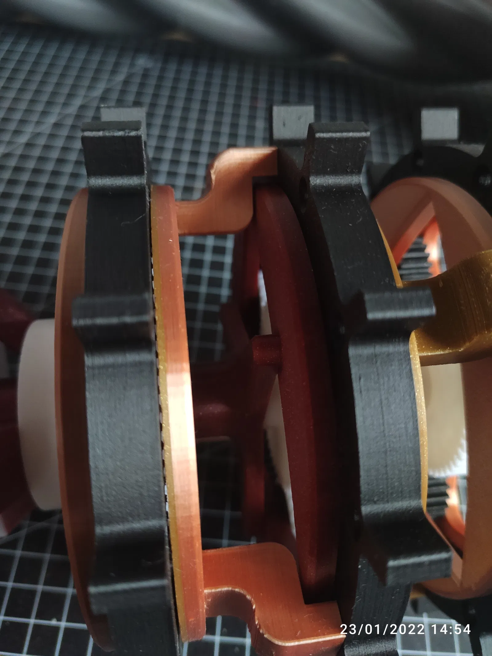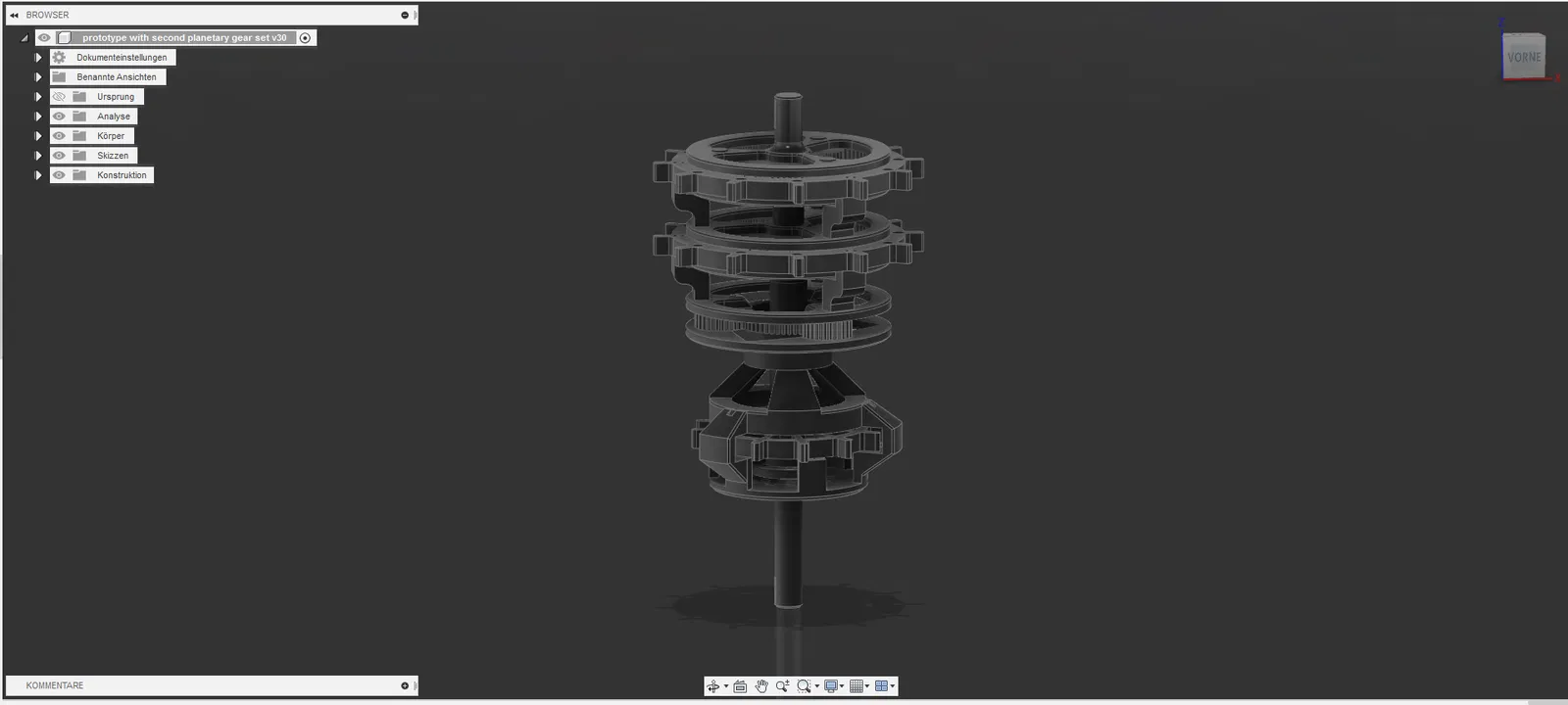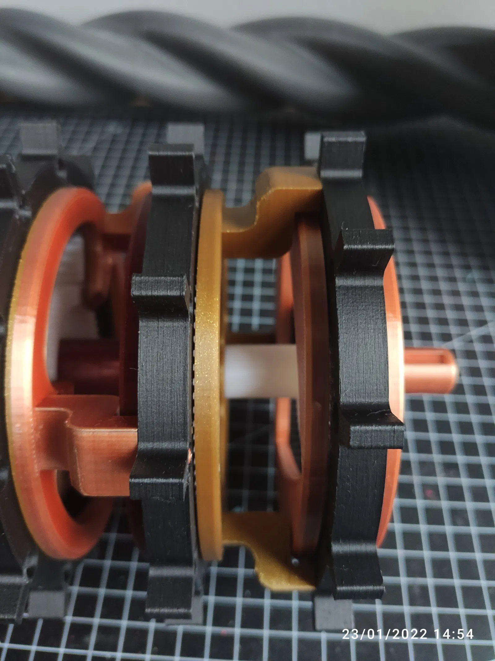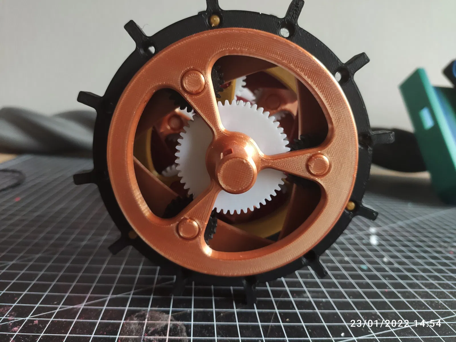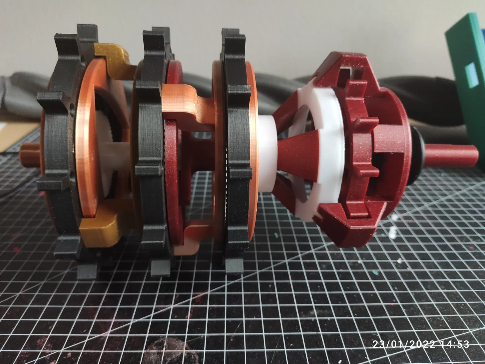 - Hạ các bộ phận đã lắp ráp trước đó qua lỗ trong "planet carrier back (in 3 lần)". Phần này hơi khó, đảm bảo các bánh răng hành tinh và bánh răng mặt trời ăn khớp đúng cách. Ba chốt, cũng là trục cho các bánh răng hành tinh, phải vào "planet carrier front (bộ thứ hai)". Bây giờ bộ bánh răng hành tinh thứ hai trong ba bộ đã được lắp ráp, gần xong!