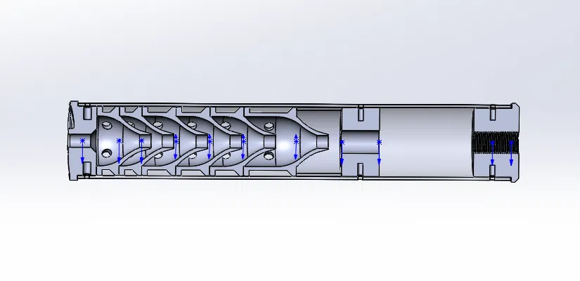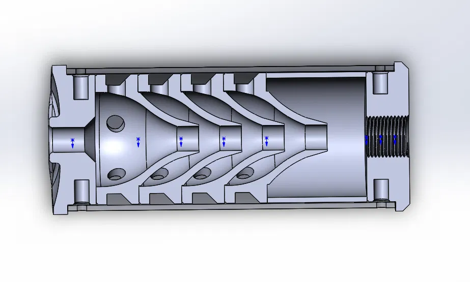 A moderator of any length, including an integrated one, can be assembled from a set of cones. The moderator is assembled on the basis of a 40x1.5 mm aluminum tube. Secure the covers and the sprocket with the m3 mounting screws. There is an m12 thread in the back cover. For installation on pistols with internal thread, I recommend using an m12 threaded tube.