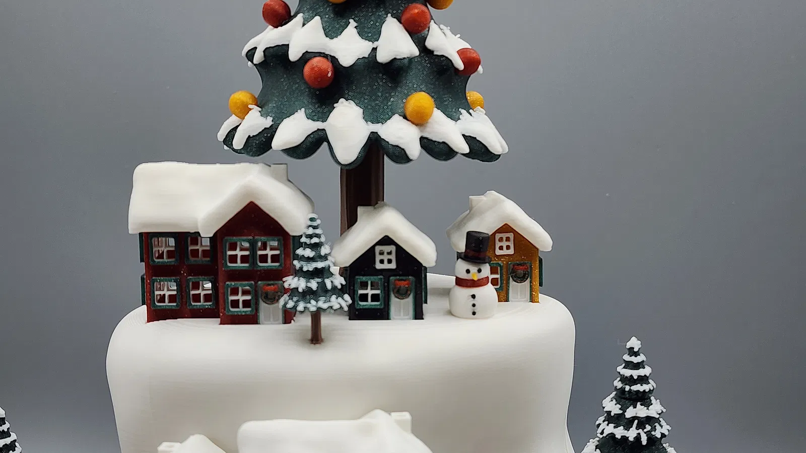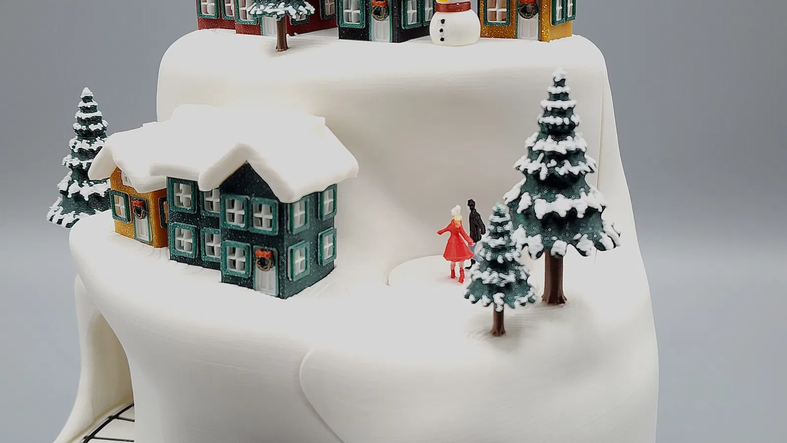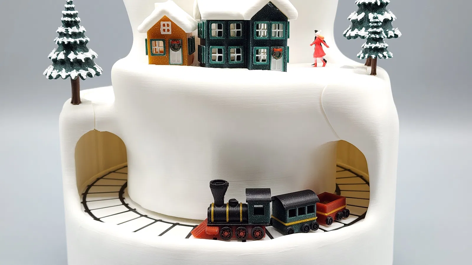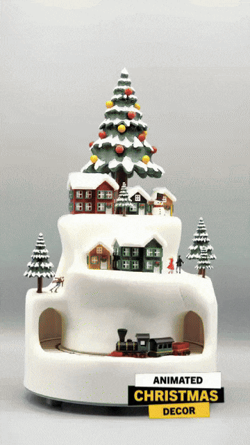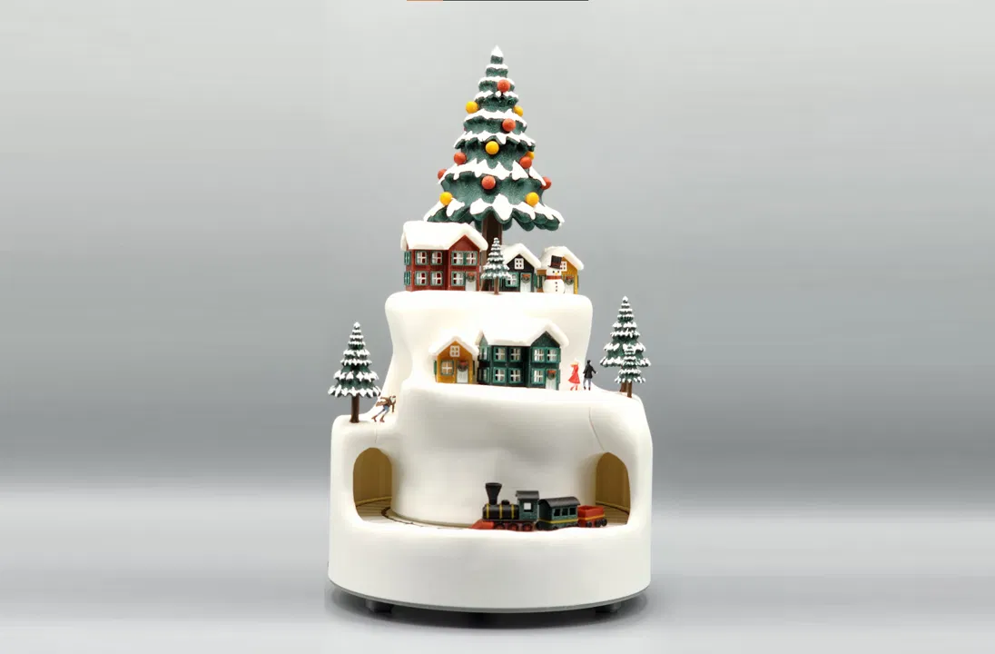 Trang trí Giáng Sinh hoạt hình tuyệt đẹp với làng tuyết, cây cối lấp lánh và đoàn tàu di chuyển. Tích hợp đèn LED và phát nhạc MP3 tùy chỉnh. Lý tưởng cho máy in nhỏ, mang đến trải nghiệm lễ hội sống động.