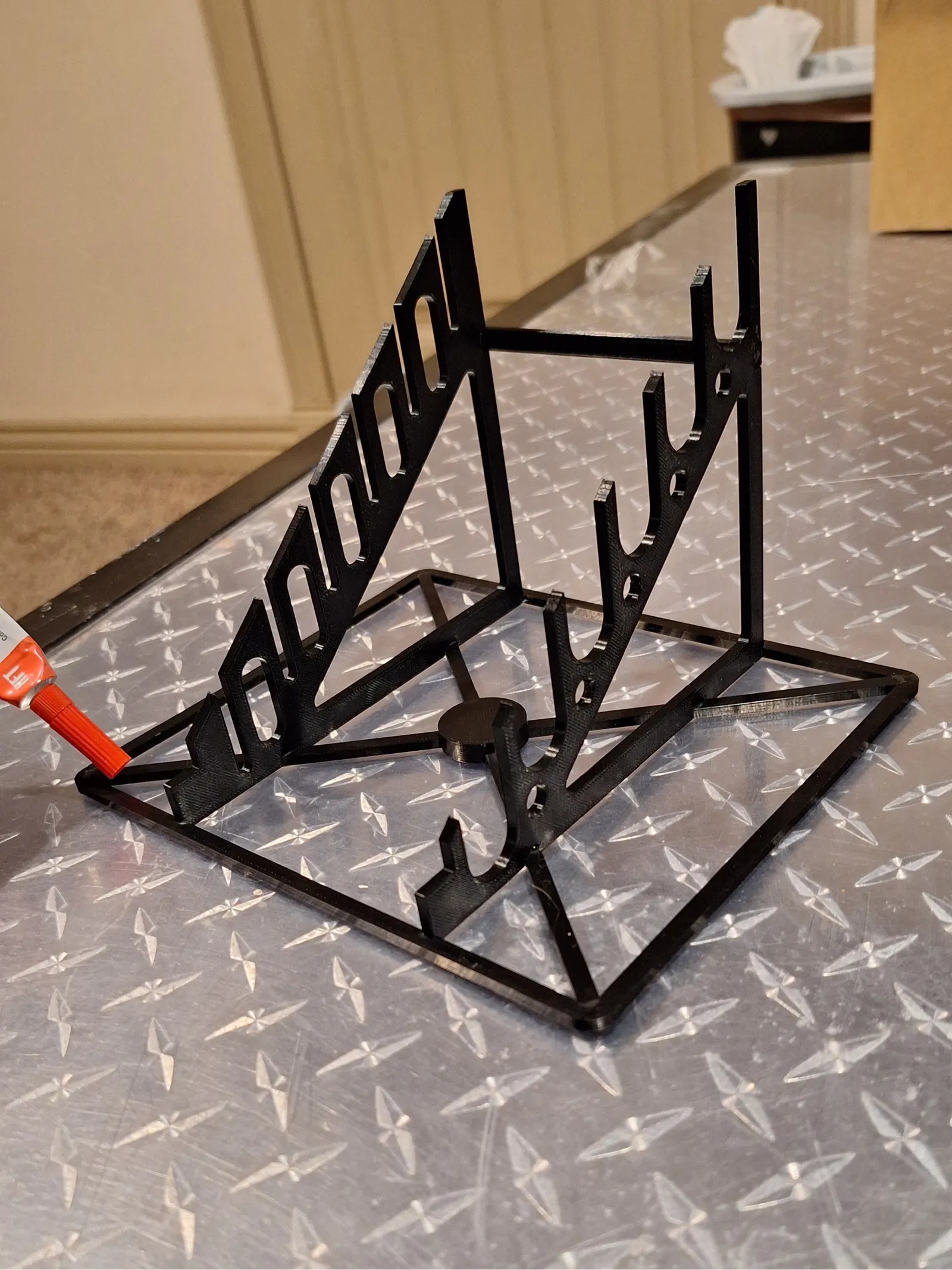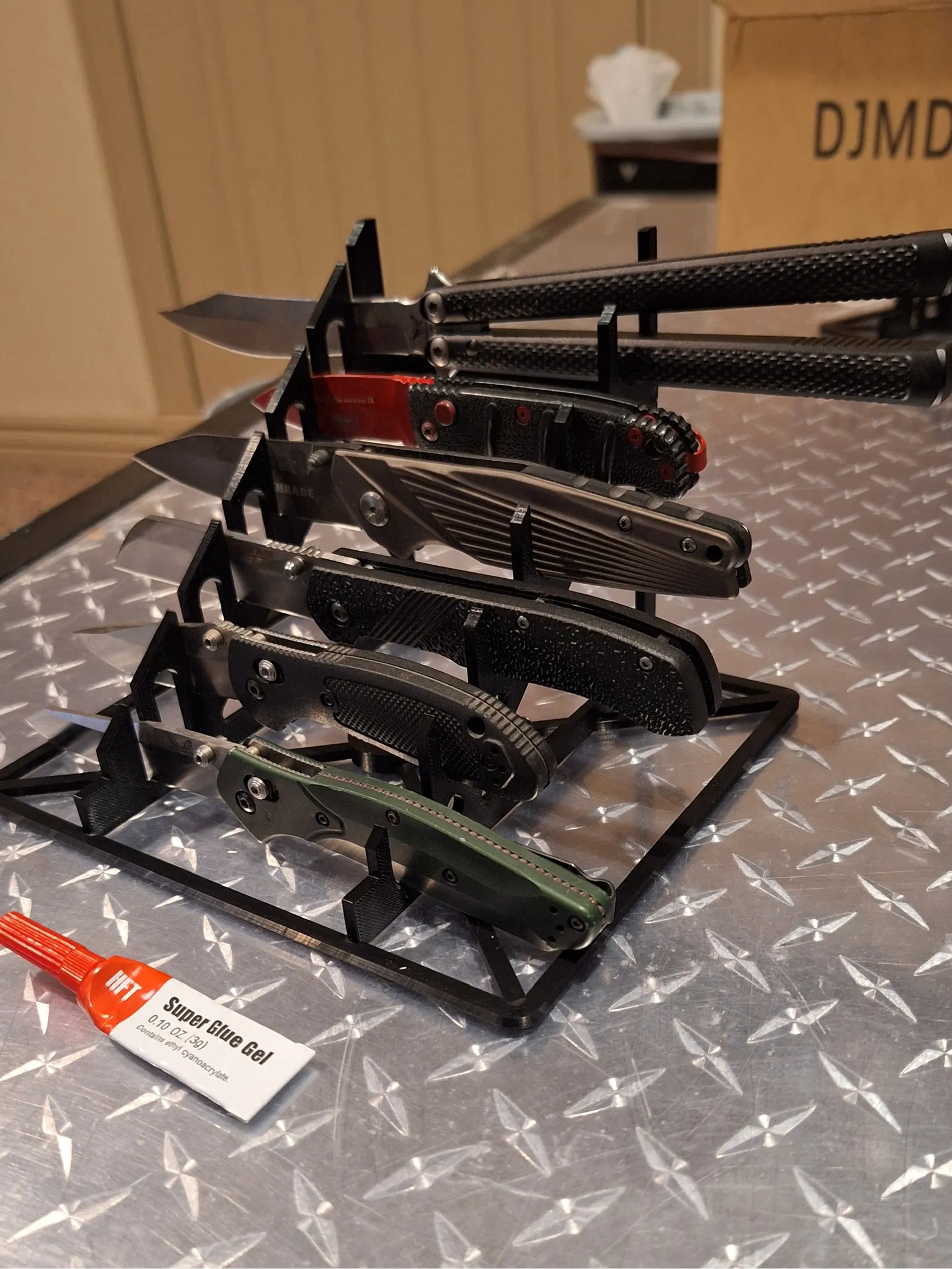 Dùng keo 502 dán các khớp nối! Đặt lên kệ, hoặc dưới bồn rửa, tui không quan tâm. Kệ này vừa vặn để đựng dao EDC kích thước thường ở vị trí mở, phù hợp để trưng bày trong hộp nhựa trong suốt.