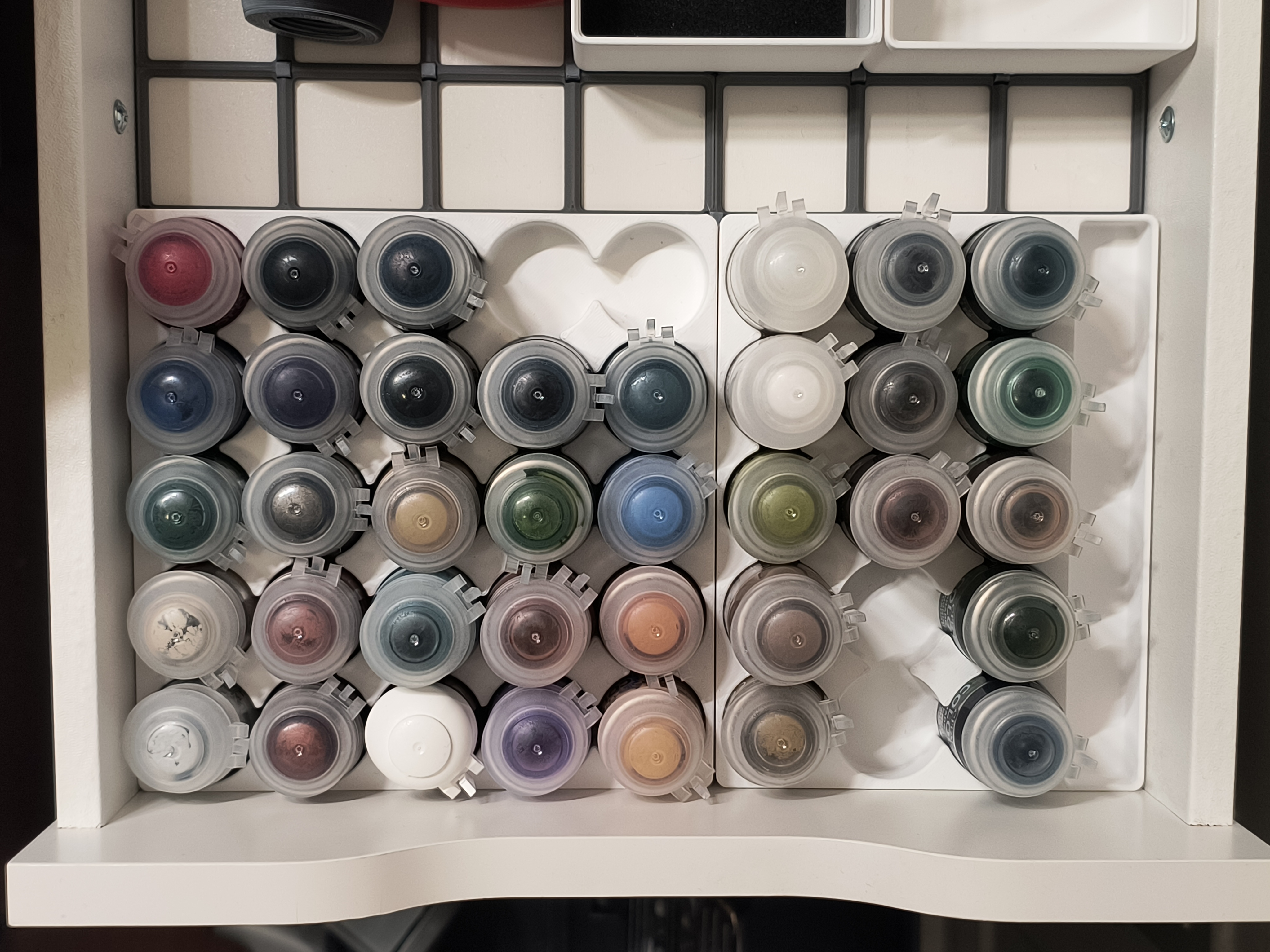 Hai đế cắm sơn Citadel cho Gridfinity, loại 4x4x3U (chứa 25 lọ sơn) và loại 4x3x3U (chứa 15 lọ sơn). Khi kết hợp lại, chúng vừa vặn trên ngăn kéo bàn IKEA Alex.