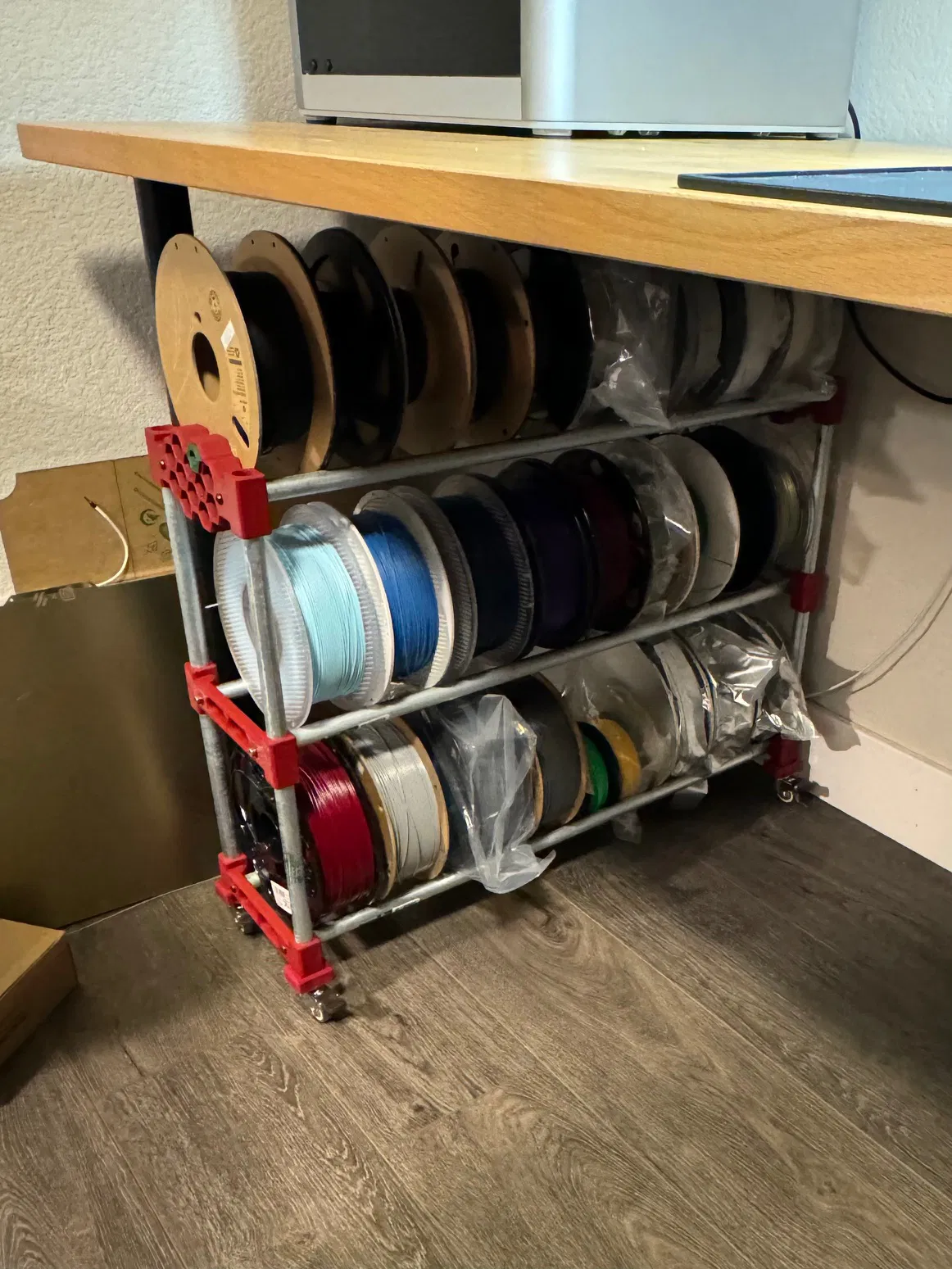Tạo giá đỡ cuộn dây tóc 3D dạng con lăn có thể mở rộng, được làm từ ống luồn dây điện kim loại rẻ tiền. Có tùy chọn cấu trúc dạng tổ ong để tùy chỉnh, bánh xe có thể tháo rời và khóa, cùng các bộ phận in nhanh hơn. Lý tưởng để lưu trữ dây tóc PLA hiệu quả.