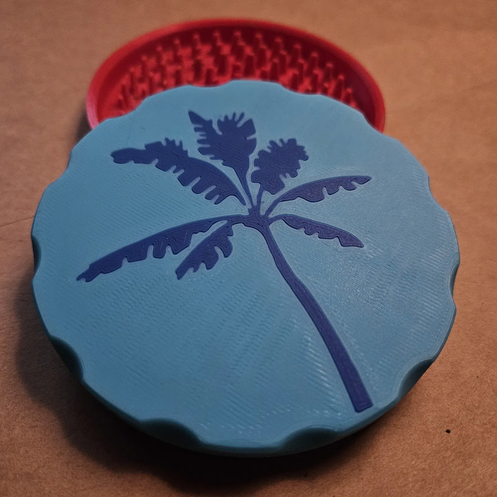 Cối xay 2 màu có in hình cây dừa. In với độ dày vật liệu (infill) tối thiểu 40% hoặc cao hơn. Không cần in kèm giá đỡ (support). Bạn cần có nam châm 10mmx10mm và vòng đệm 10mm cho ốc vít (loại mỏng).