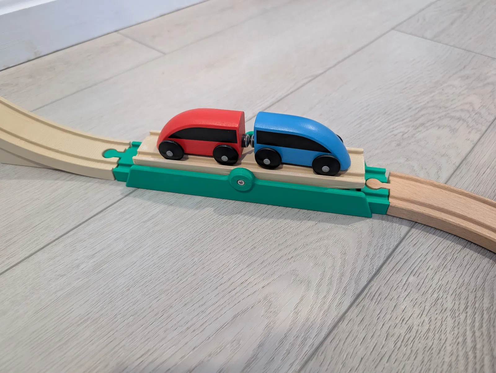 Cái bập bênh này sẽ dùng được với xe lửa Brio, Ikea, và tất cả các bộ xe lửa gỗ tương tự khác. Phần này có đường ray dài 216mm, tương đương với một mảnh loại “D” của Brio.