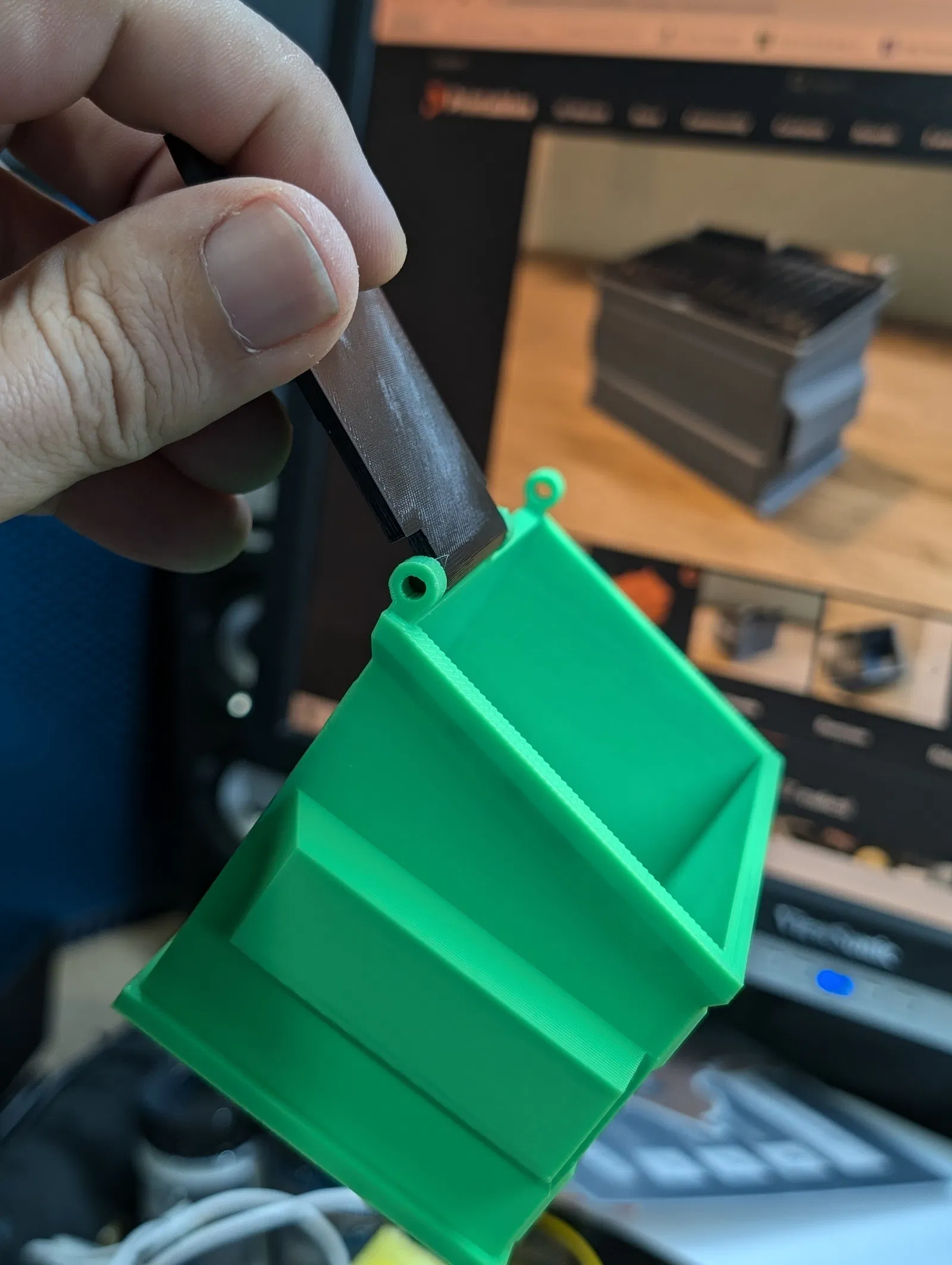 Nếu cảm thấy hơi chặt, bà con có thể cắt/chà nhám/dũa/gặm cái đầu nhọn kia đi một chút để có thêm không gian. Tui có in bằng PLA và PETG đều không gặp vấn đề gì hết.